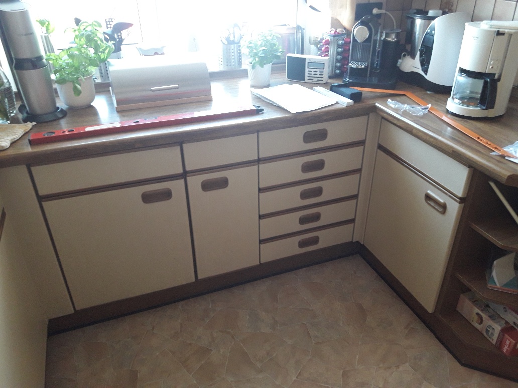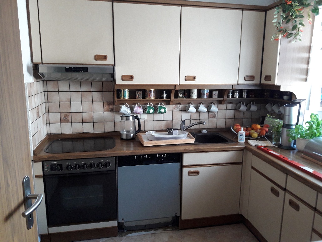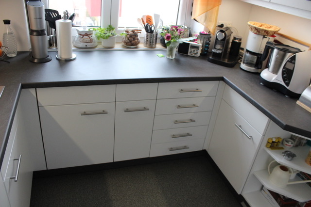 Alle Korpen wurden behalten, erneuert wurden die Geräte, die Arbeitsplatte, die Fronten, alle sichtbaren Außenseiten wurden passend lackiert, und der Fließenspiegel wurde verkleidet. Durch die neuen Fronten wirkt die Küche nun deutlich moderner.