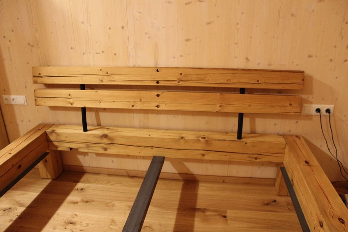 Aus alten Balken entstand dieses Bett. Neu abgeschliffen verleihen sie dem Bett eine warme Optik. Die noch existierenden Risse in den Balken geben dem Ganzen einen Hauch von Altem.