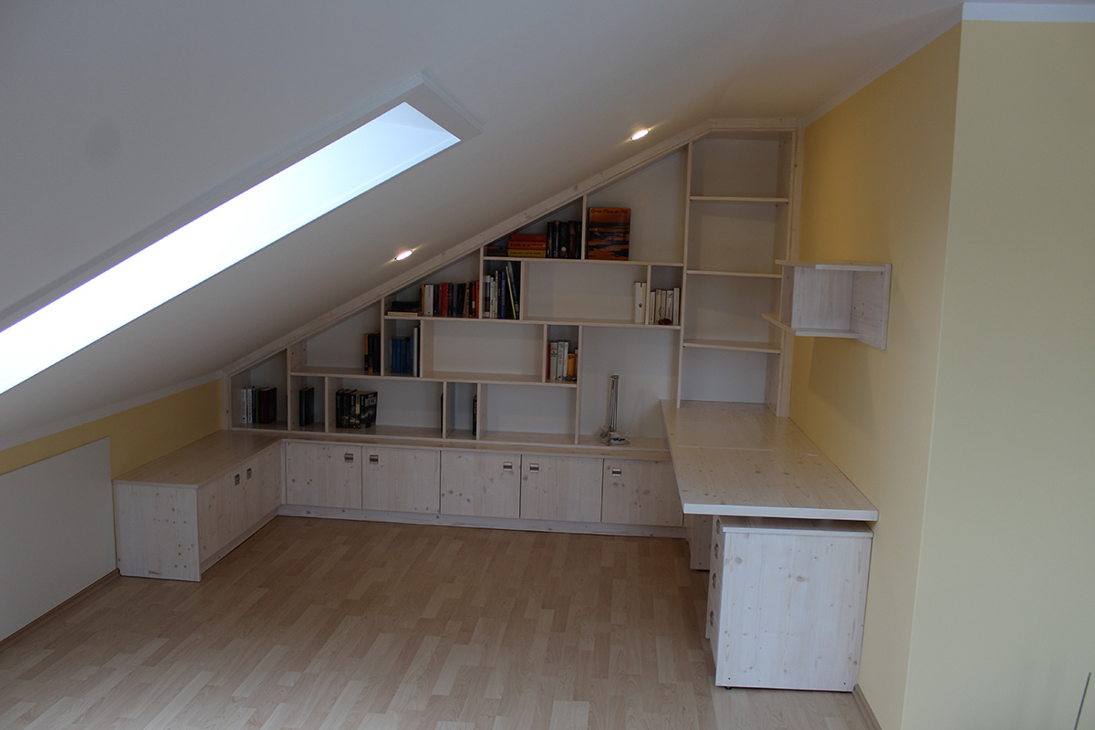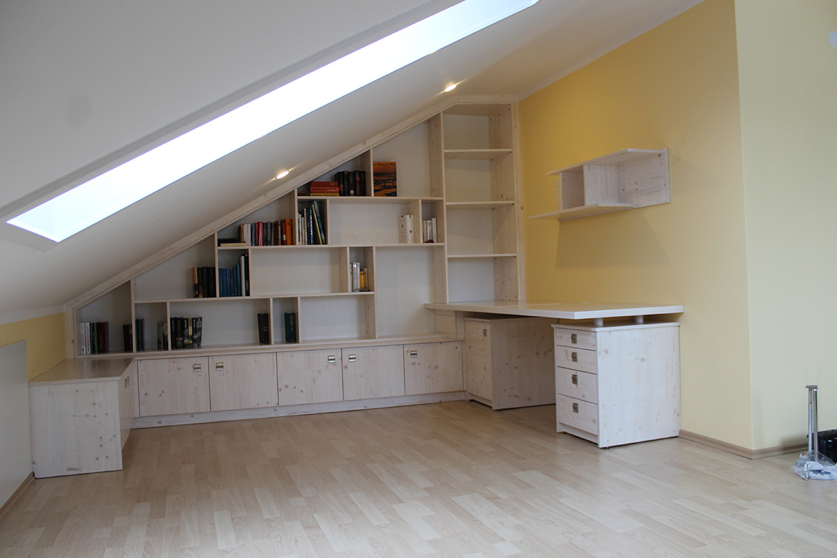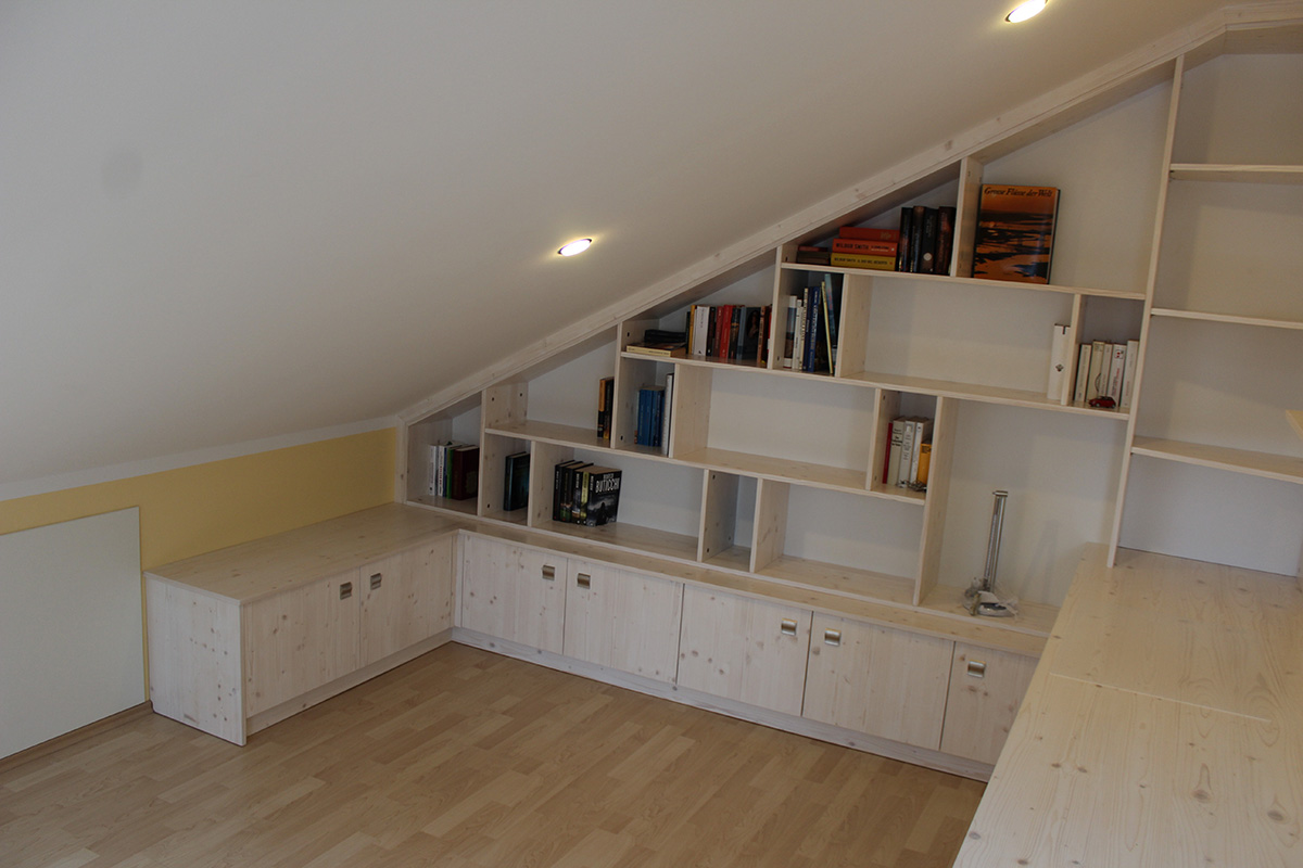 Um das Büro effektiv ausnutzen zu können, wurden alle Elemente passgenau unter der Dachschräge gefertigt und montiert. Die meisten Oberflächen durften ihren natürlichen Charme behalten. Ein Regal über der Schreibtischplatte ergänzt die Komposition. Ausgestattet mit Auszügen, Fächern und Ablagen, bietet es ausreichend Platz für alle benötigten Dinge.