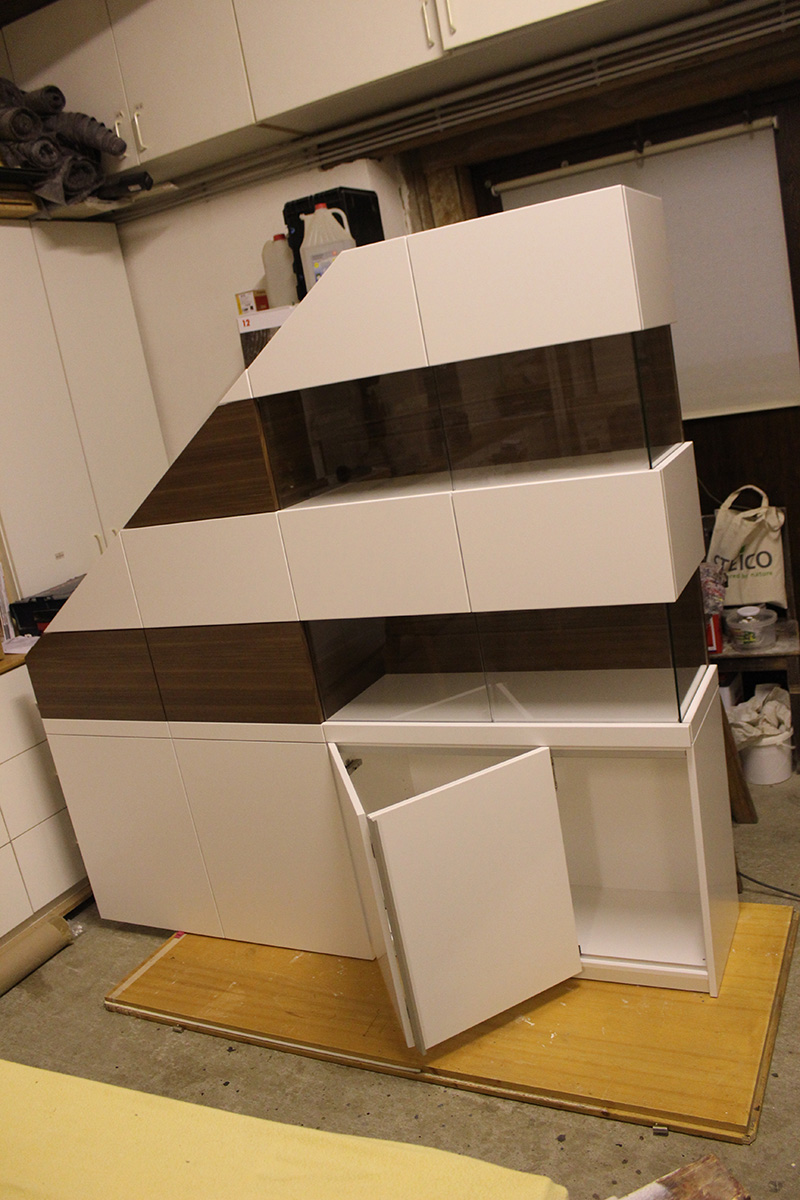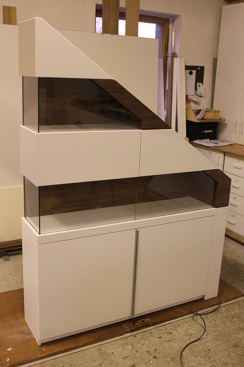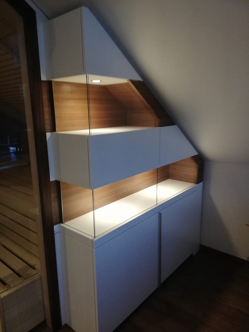 Die Herrausforderung bestand darin, zum einen die Dachschräge abzufangen, als auch den Stil auf die bereits vorhande Saune abzustimmen. Als optisches Highlight besteht der Schrank auch etagenweise aus Vitrinen. Der Wechsel zwischen dem robusten Holz und dem zerbrechlichen Glas gibt dem Ganzen etwas Besonderes.