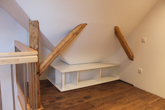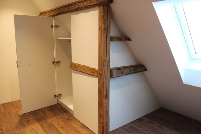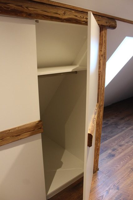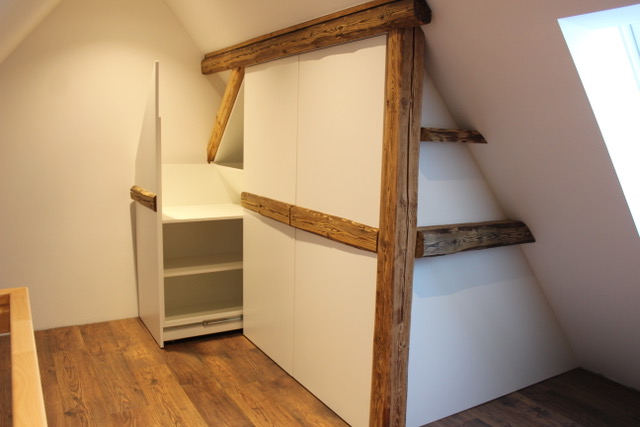Diesen Schrank erkennt man nicht gleich auf den ersten Blick. Mit Altholz wurde ein Teil des Dachgebälks simuliert, in welchen der Schrank untergabracht ist. Somit erhielt die glatte Dachschräge ein paar ansprechende Ecken und Kanten. Neben den Türen, welche die Fächer verstecken, kommt ein Teil des Schrankes in voller Höhe als Auszug zur Verwendung. Der Kontrast zwischen dem Weiß- und Altholz spielgelt sich im gesamten Raum wider.