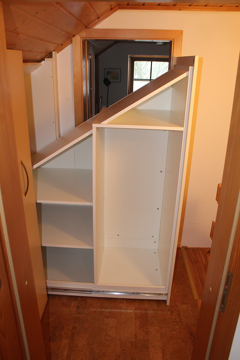 Hier wurde nur schwer nutzbarer Raum zu einem Schrank mit ordentlich Platz umfunktioniert. Besonders die Großraumauszüge bringen die Möglichkeit mit, jeden Quadratzentimeter des Bereiches gut ausnutzen zu können. Das der Schrank auch eine optische Aufwertung ist, ist dabei ein gewollter "Nebeneffekt".