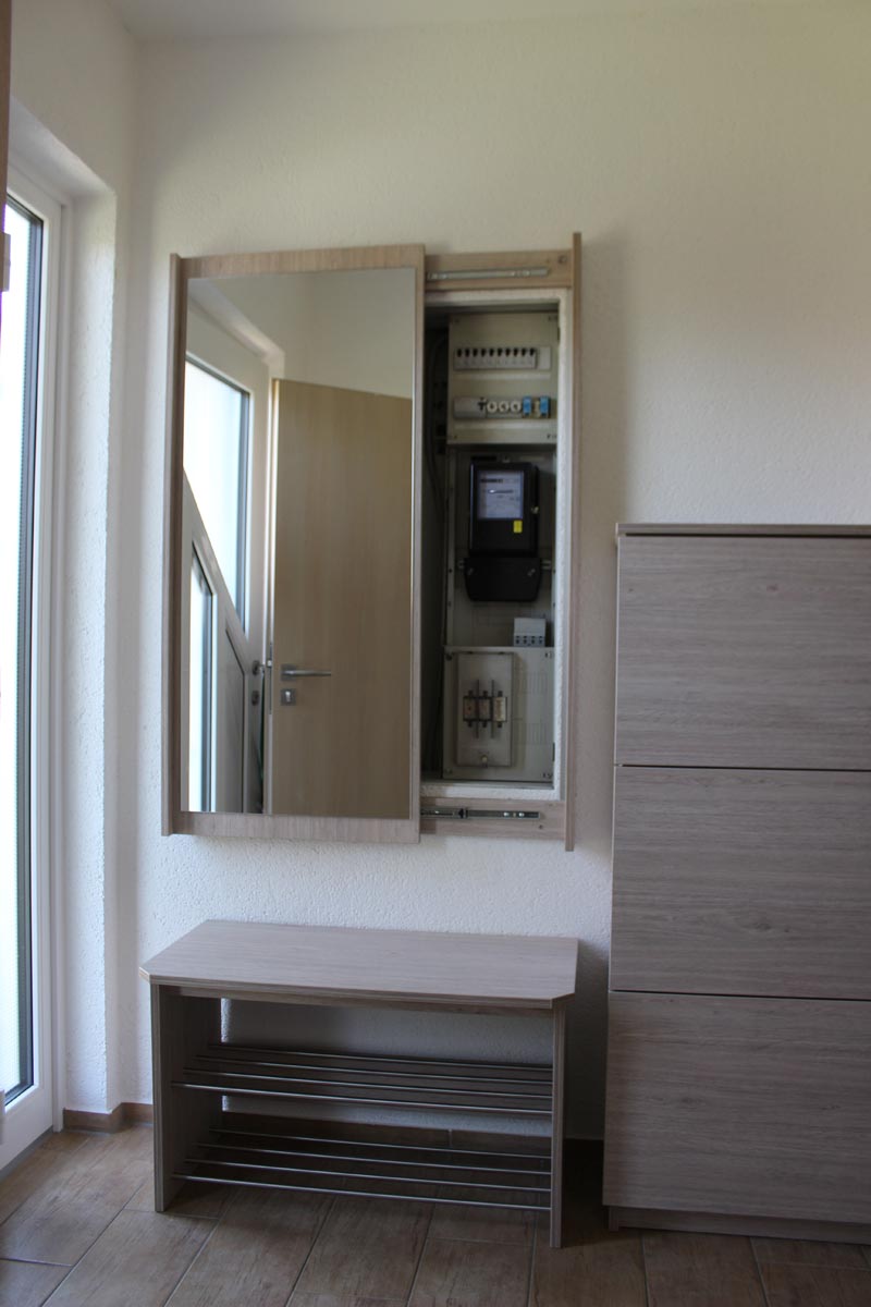 Die Garderobe in ihrem grauen Holz fügt sich gut vor den hellen Wänden ein. Das Besondere ist, dass man den Spiegel auf Schienen zur Seite wegschieben kann. Dahinter befindet sich, der Stromkasten, welcher somit dem Auge verborgen bleibt.