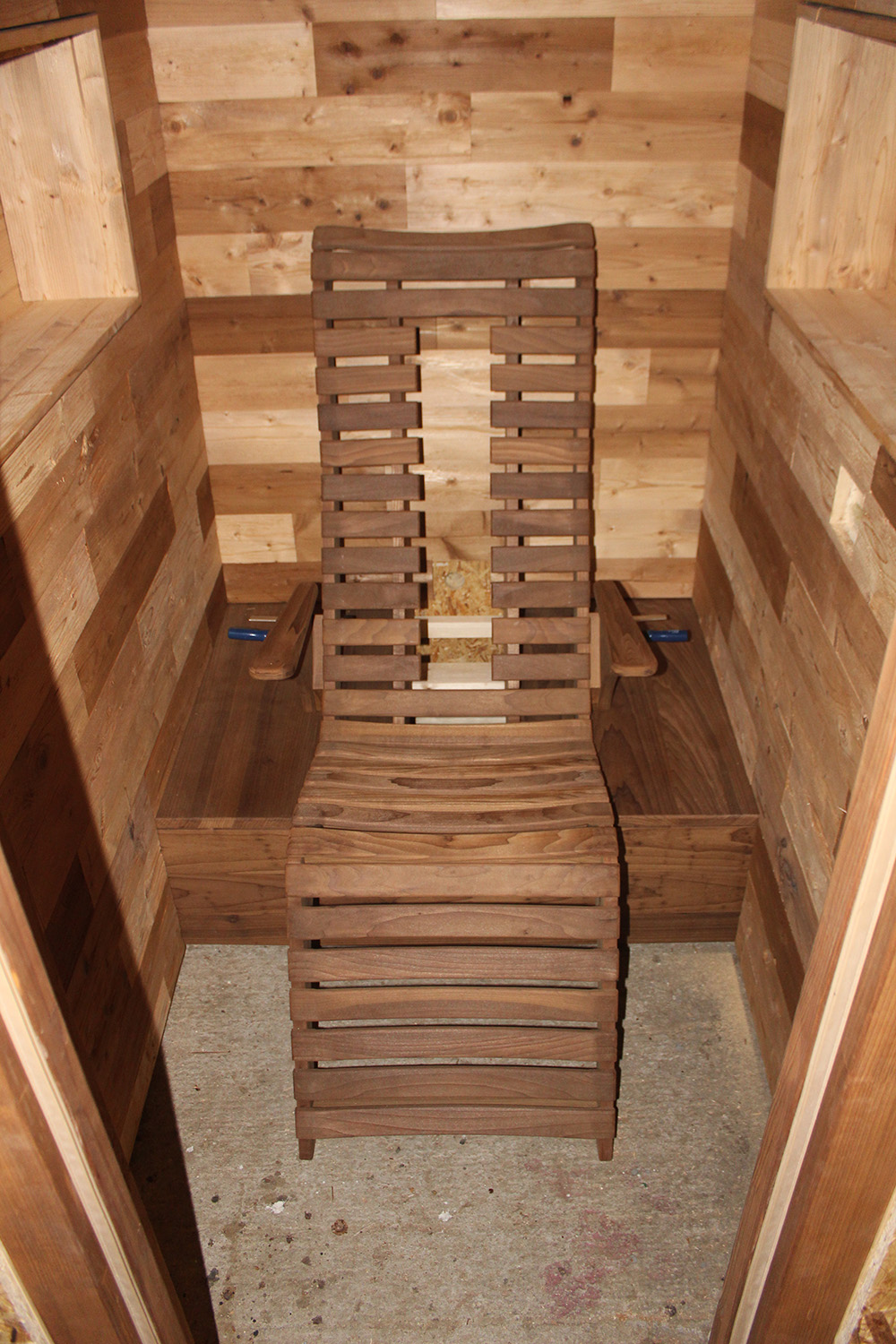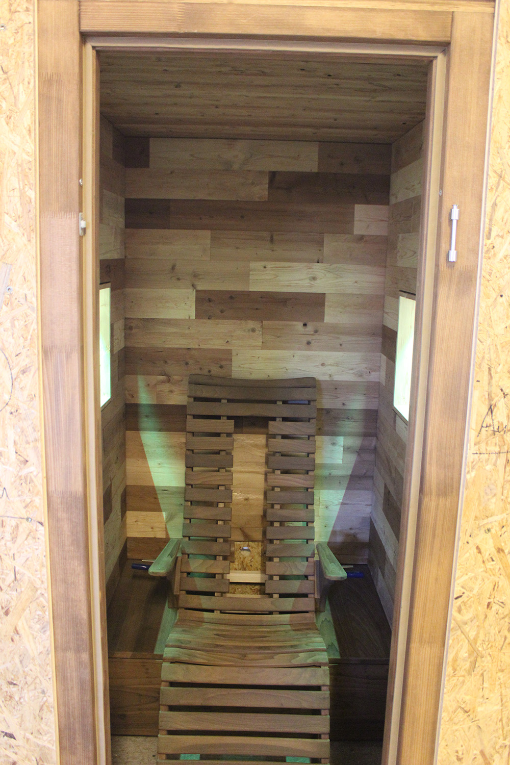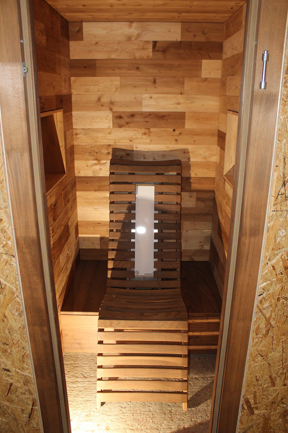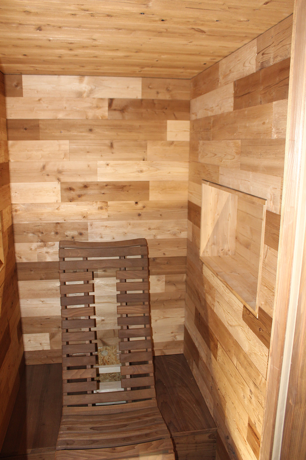 Diese individuell gestaltete Infrarotkabine ermöglicht wärmende Entspannung für den Besitzer und seine Gäste. Ob Muster der Täfelung oder die ergonomische Form des Stuhles - alles passt zueinander.