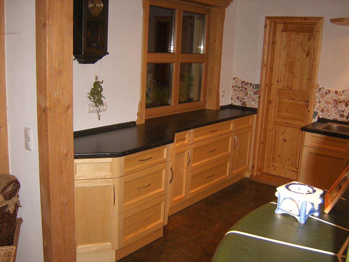 Bei dieser Küche wurde der alte Zugang vom Flur zur Küche mitverwendet. Der Durchgang wurde nur bis auf Höhe Arbeitsplatte mit Gipskartonplatte verschlossen, sodass der darin stehende Unterschrank übertief angefertigt werden konnte um weiteren Stauraum zu gewinnen. Darauf wurde ein aufstehender Hängeschrank aufgesetzt.