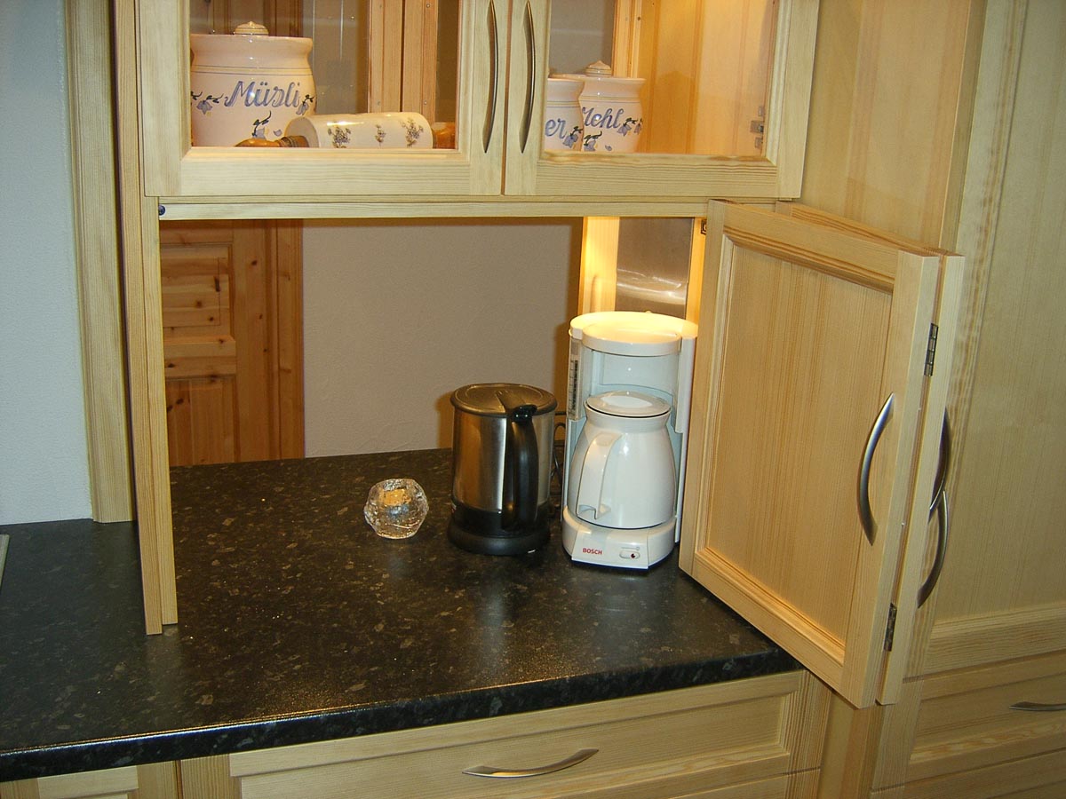 Vorn mit Falttüren, unten geschlossen damit die Küchengeräte versteckt sind, wenn man diese schließ. Die „Rückwand“ wurde als Schiebetür ausgearbeitet, welche sich hinter den angrenzenden Hochschrank verschiebt. Dadurch erhält man den Zugang zum Flur und der Einkauf kann direkt in die Küche geschoben/gestellt werden.