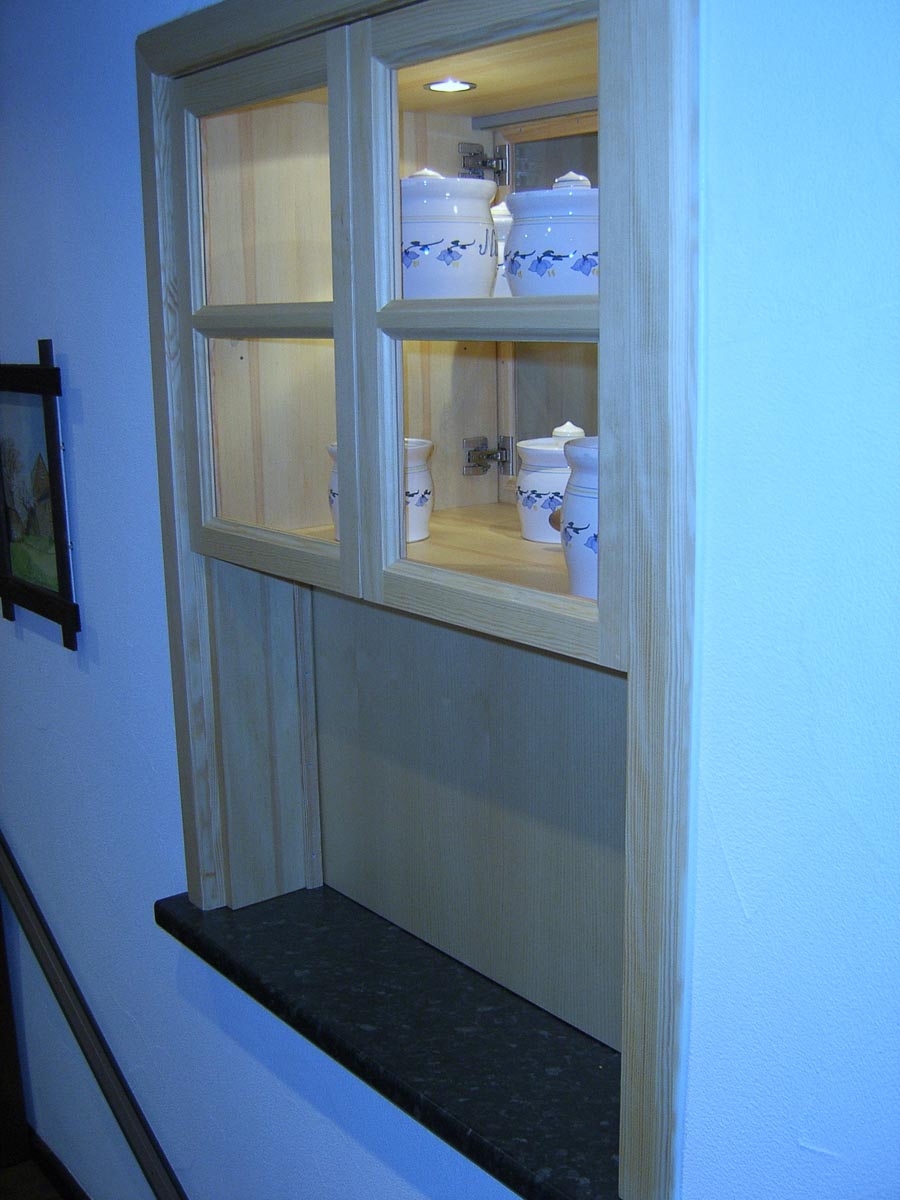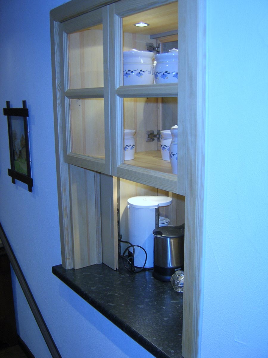 Oben besitzt der Schrank einen Rahmen mit Kreuzsprosse und Glasfüllung als Rückwand. Hier kann das natürliche Licht von Küche in den Flur gelangen. Im Flur soll die Optik des Schranks dem eines Fensters gleichen.