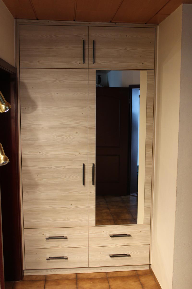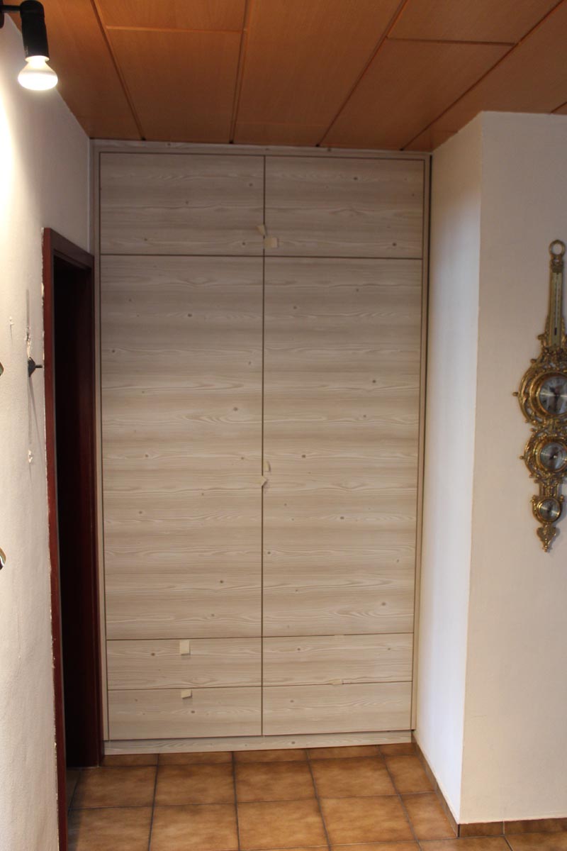 In voller Höhe füllt der neue Schrank die Nische im Flur dieses Hauses aus. Mit vielen Fächern und Auszügen wird hier werttvoller Stauraum geschaffen.
