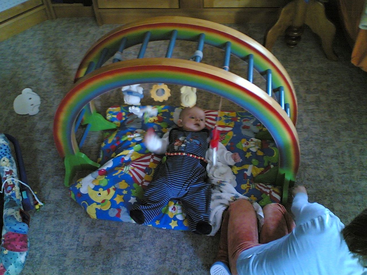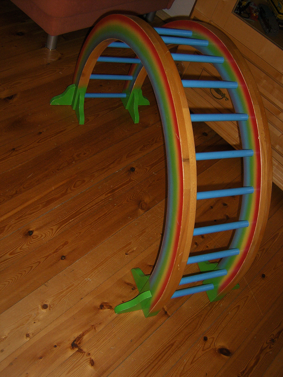 Der Regenbogen dient nun als Himmel für das Kleine. Der hängt nicht voller Geigen, aber voller Mobiles.