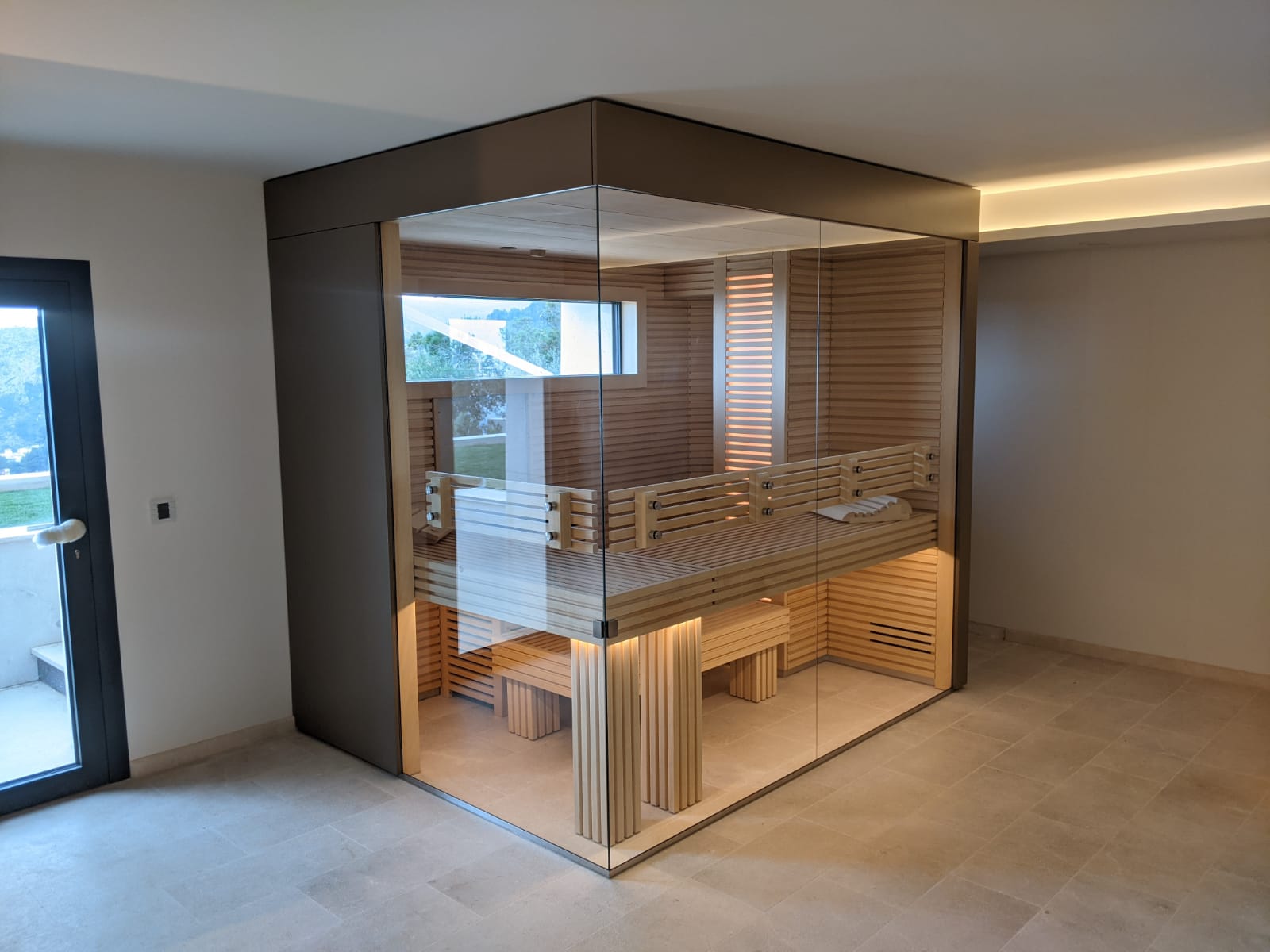 Die Kombination aus Glas und Holz verleiht der Sauna eine gewisse Eleganz. Diese wurde auch auf den Nischenschrank übertragen.