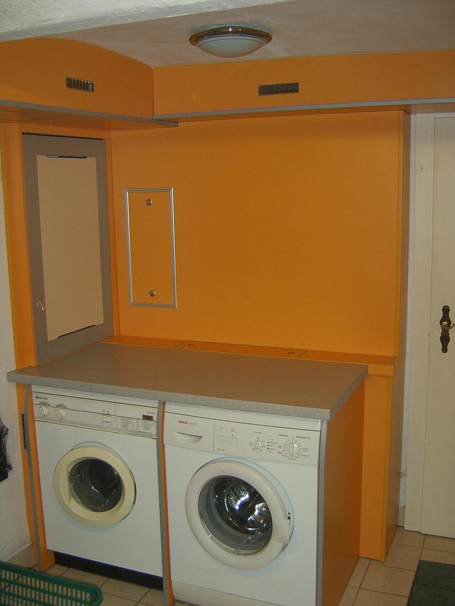 Bei diesem Projekt wurde zusätzlicher Stauraum für die Waschküche praktisch eingebaut. Es entstanden Stauraum und Regale für alles, was dort benötigt wird. Dabei wurde auch daran gedacht, dass die Zugänge zu Strom- und Wasseranschlüssen verdeckt sind, trotzdem aber gut und einfach erreichbar sind.