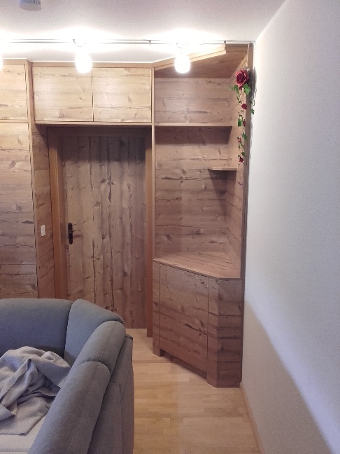 Diesmal wurde die komplette Wohnwand in einer Dachschräge verkleidet. Dabei sind sowohl die vorhandene Zimmertür integriert, als auch zusätzlicher Ablageplatz geschaffen worden. Das spezielle Muster der Oberfläche verändert die Optik des Raumes zum Positiven.