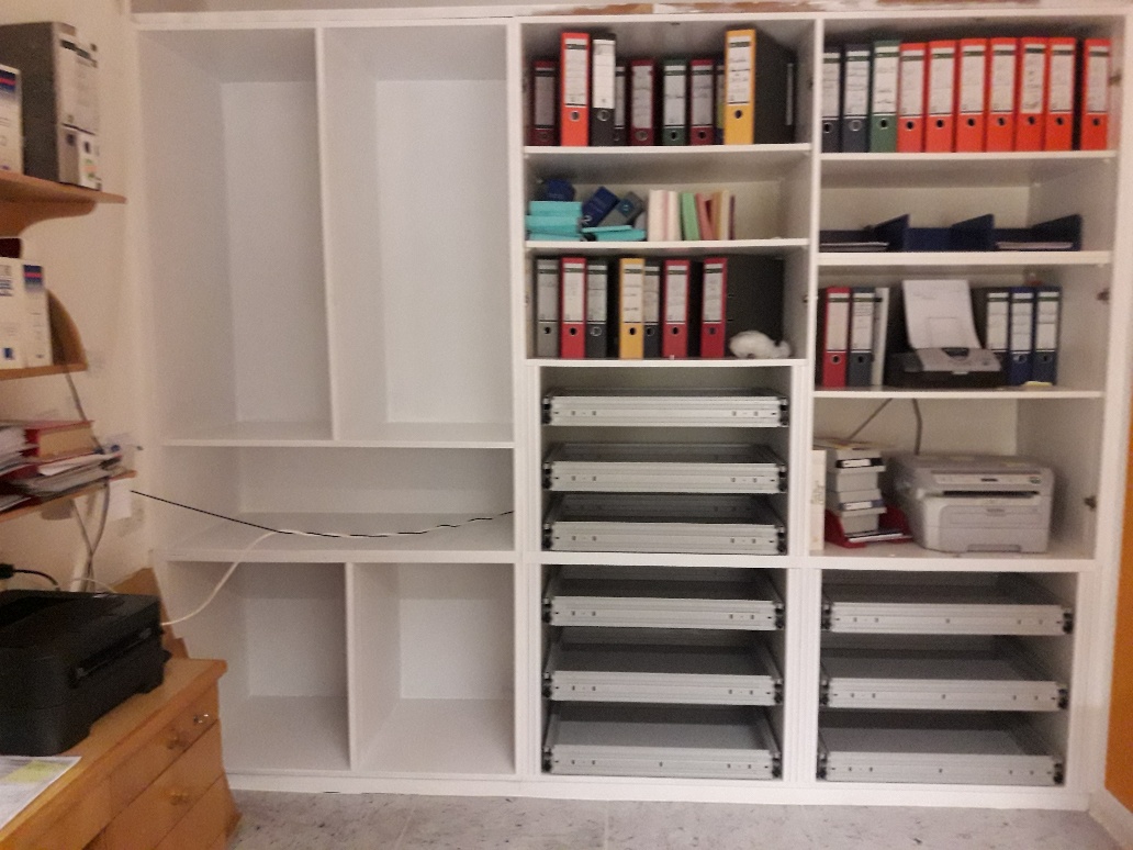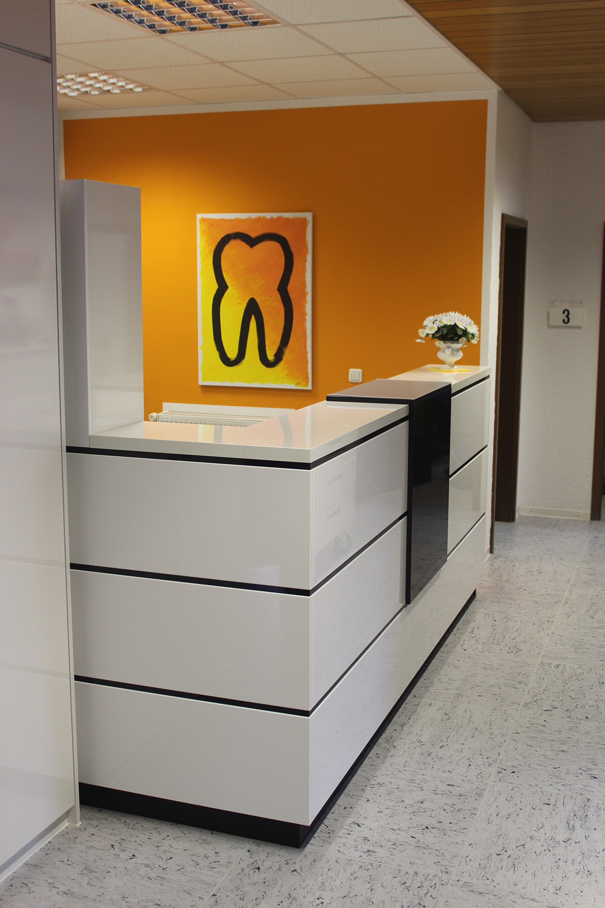 In dieser Praxis wurde der Einbauschrank erhalten und lediglich mit neuen Türen und Schubkästen ausgestattet. Der Schrankkörper wurde ebenfalls den neuen Blenden und Türen angepasst.