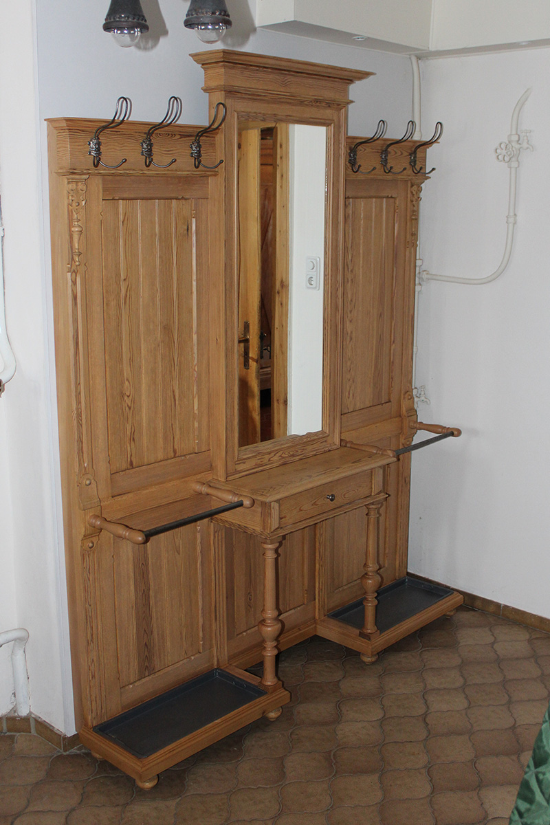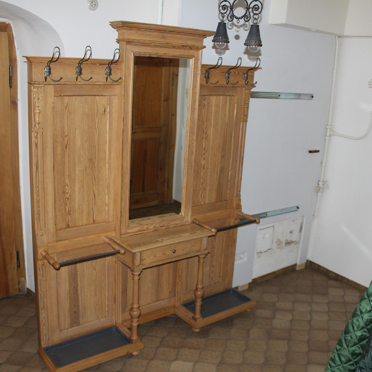 Diese Garderobe ist verschiebbar. Das muss sie auch sein, denn dahinter befindet sich die Wartungsklappe zum Kamin. An diese muss man nach jedem Kaminkehren gelangen können. Funktion trifft Schönheit.