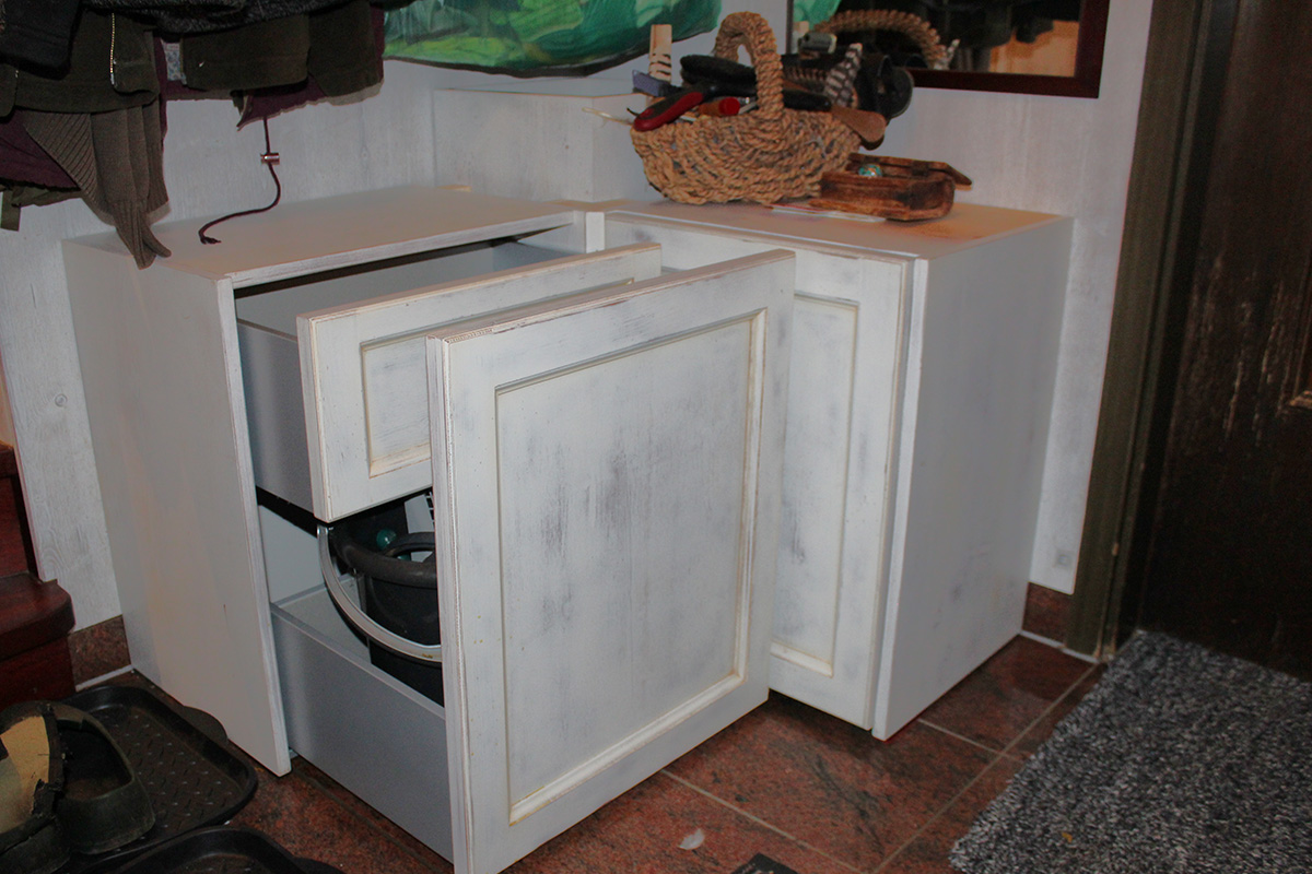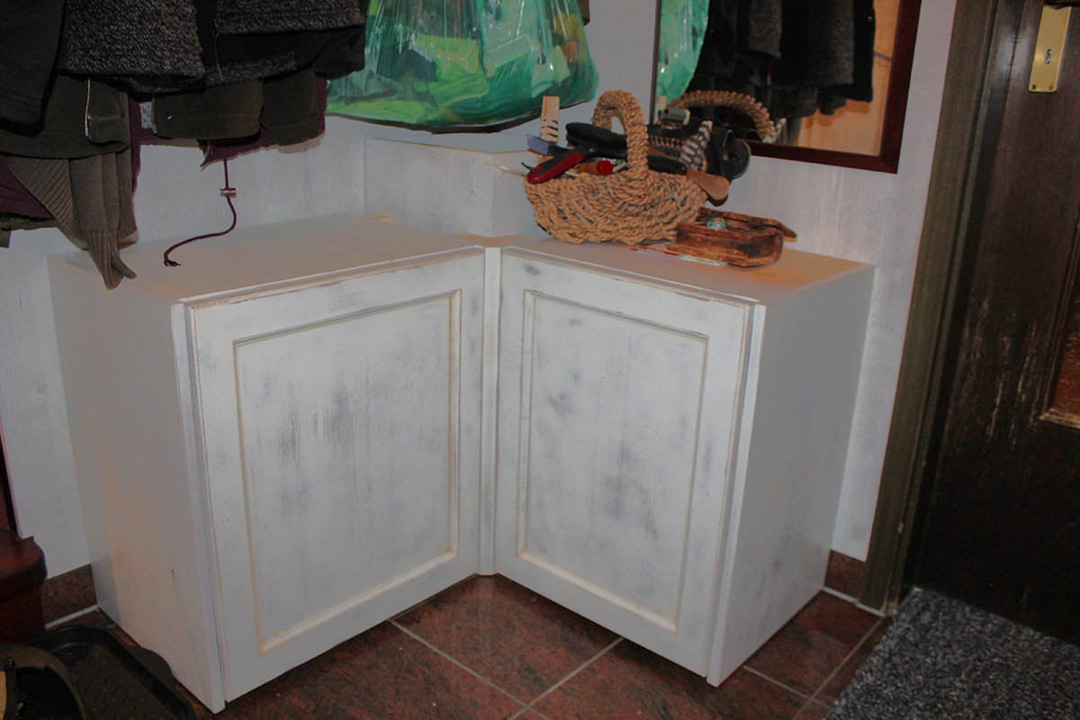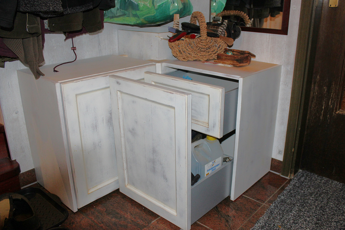 Zwei weiße Eckschränke im Vintage‑Look bilden eine praktische und vielseitig nutzbare Garderobe mit viel Stauraum für allerlei Alltagsgegenstände – ideal für kleine Eingangsbereiche.