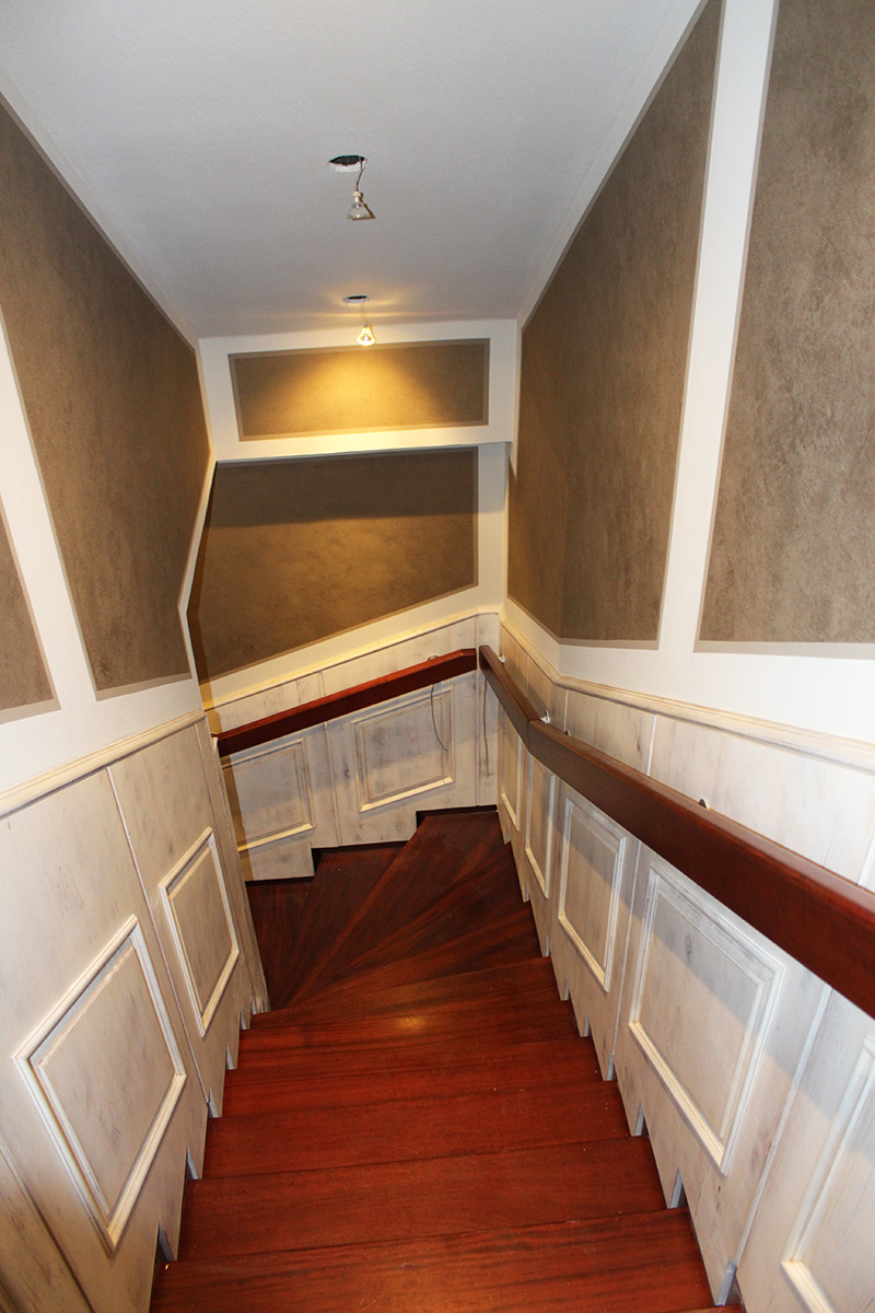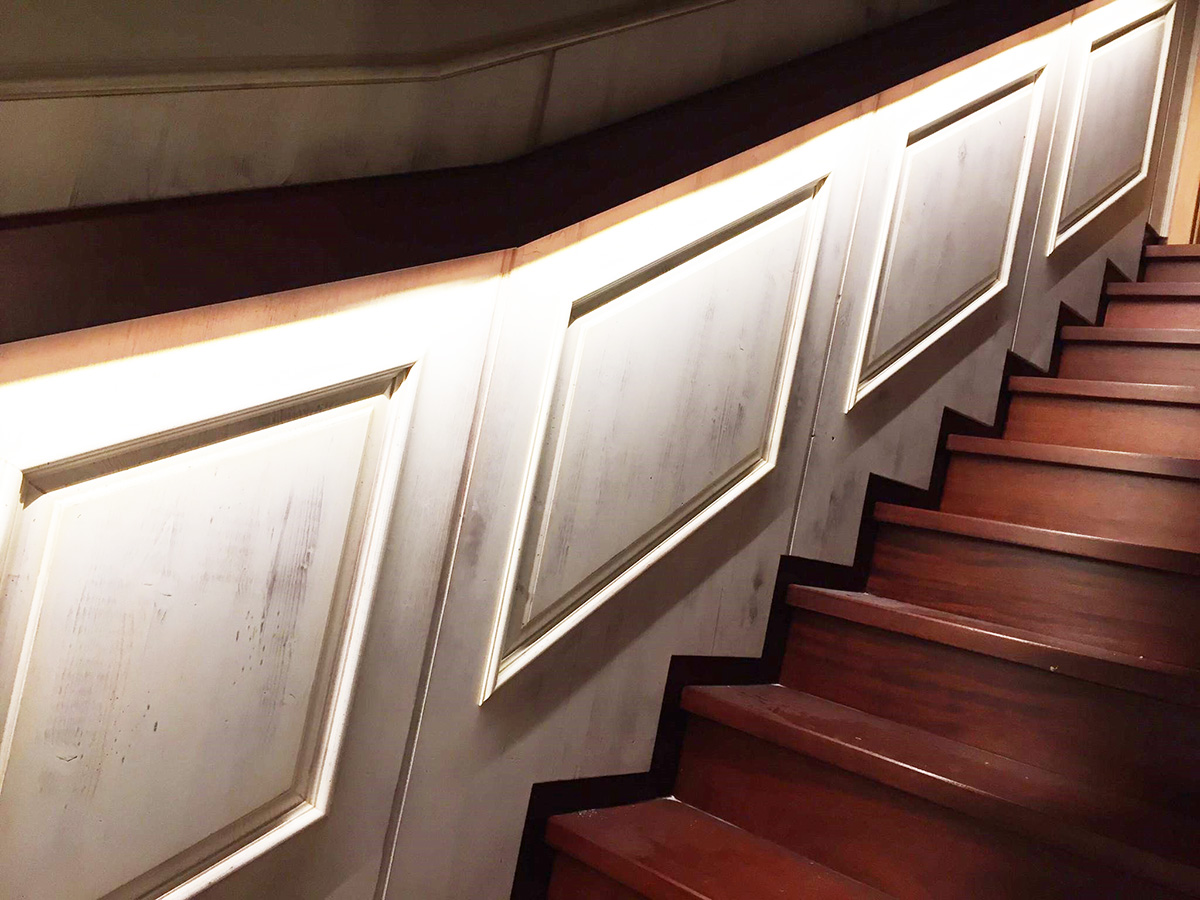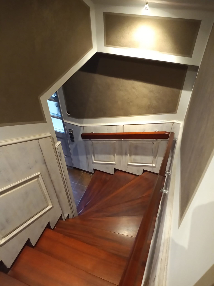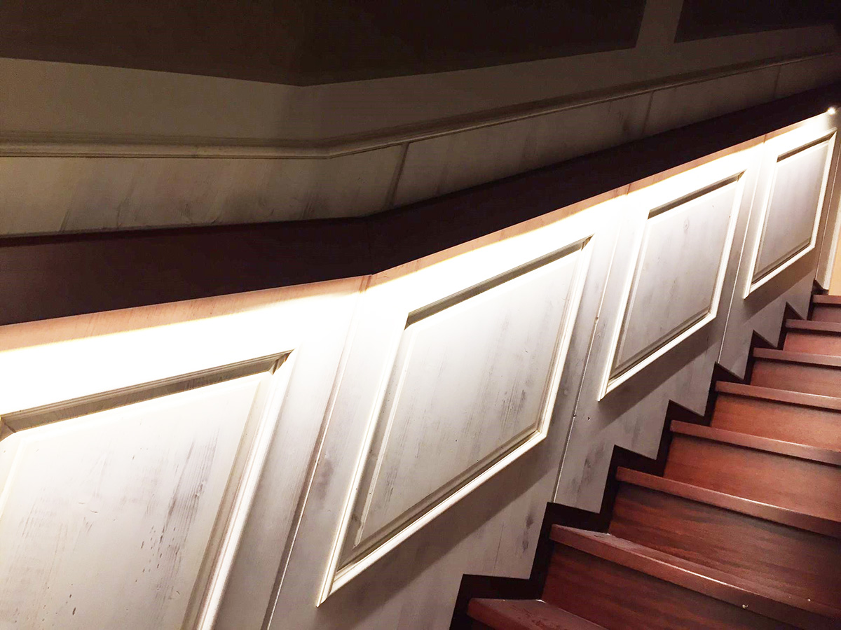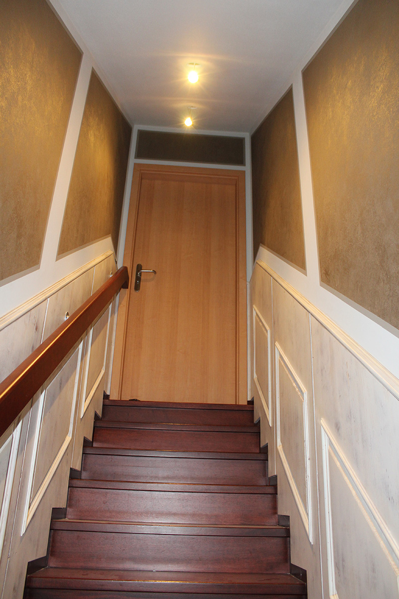 Der Treppenaufgang wurde mit präzise gefertigten Stufen und einem schlanken Geländer aufgebaut, das sich harmonisch in den Raum einfügt. Unter der Geländerunterseite sorgt eine integrierte, indirekte Beleuchtung für eine sanfte Lichtlinie, die den Aufgang sicher und zugleich modern inszeniert. So entsteht eine klare, elegante Verbindung zwischen Funktion und Design.