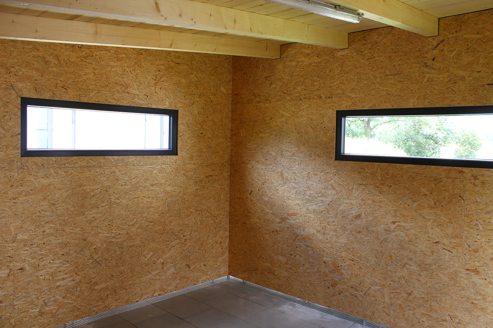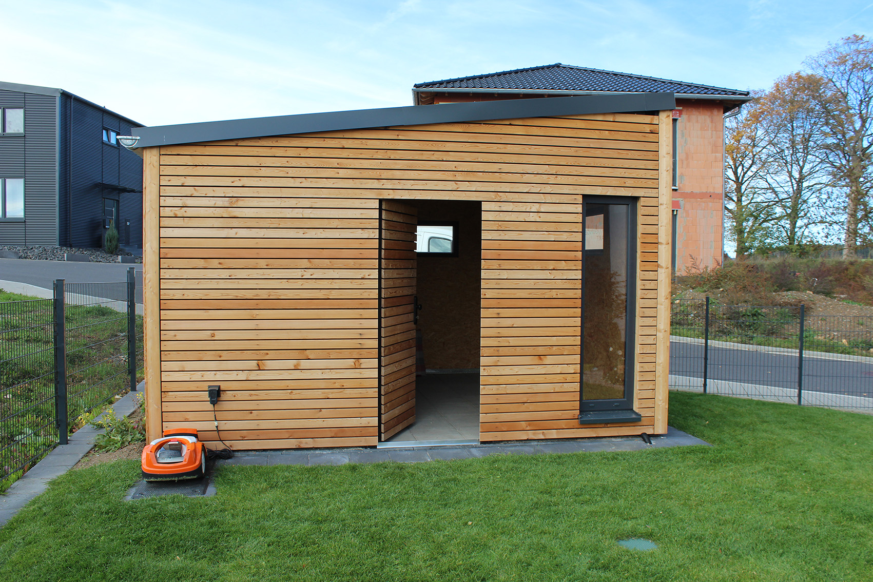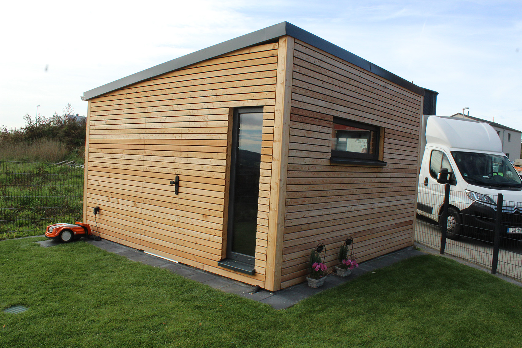 Neben dem modernen Steinhaus ergänzt dieses Gartenhaus das Anwesen mit einem natürlichen Rohstoff - Holz. Die Form lehnt sich dabei wieder an die Moderne des Hauptgebäudes an. Gleichzeitig dient es auch als "Tankstelle" für den Rasenroboter.