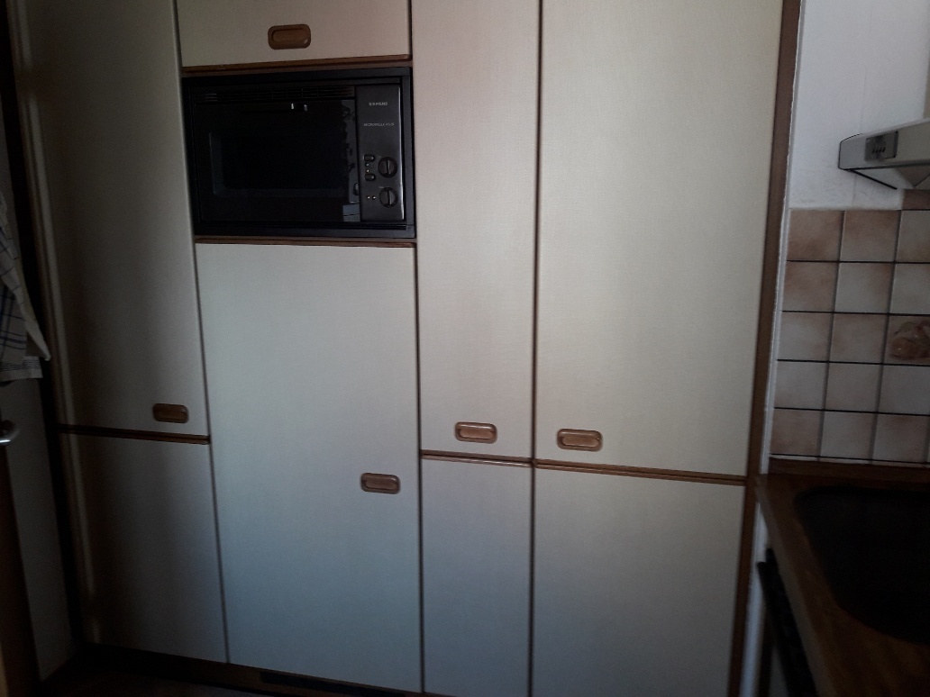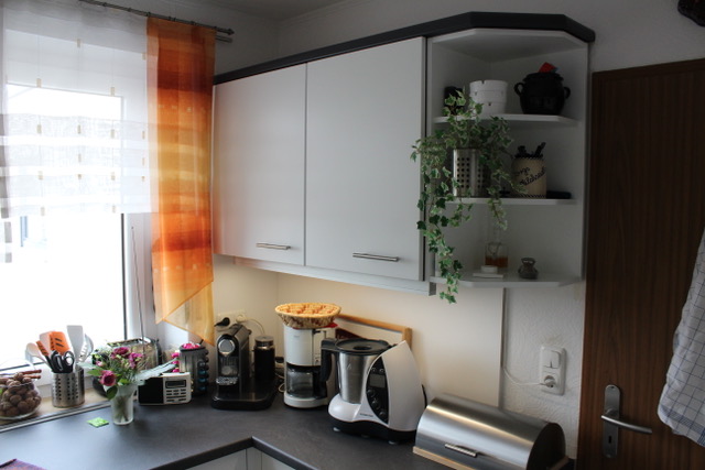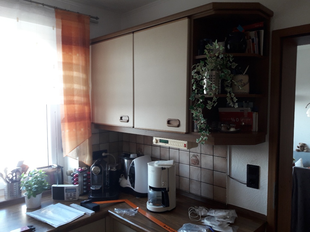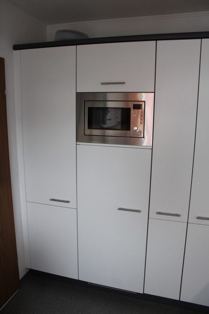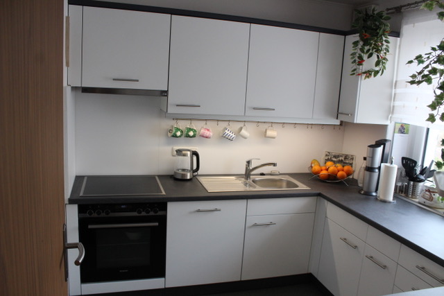 Alle Korpen wurden behalten, erneuert wurden die Geräte, die Arbeitsplatte, die Fronten, alle sichtbaren Außenseiten wurden passend lackiert, und der Fließenspiegel wurde verkleidet. Durch die neuen Fronten wirkt die Küche nun deutlich moderner.