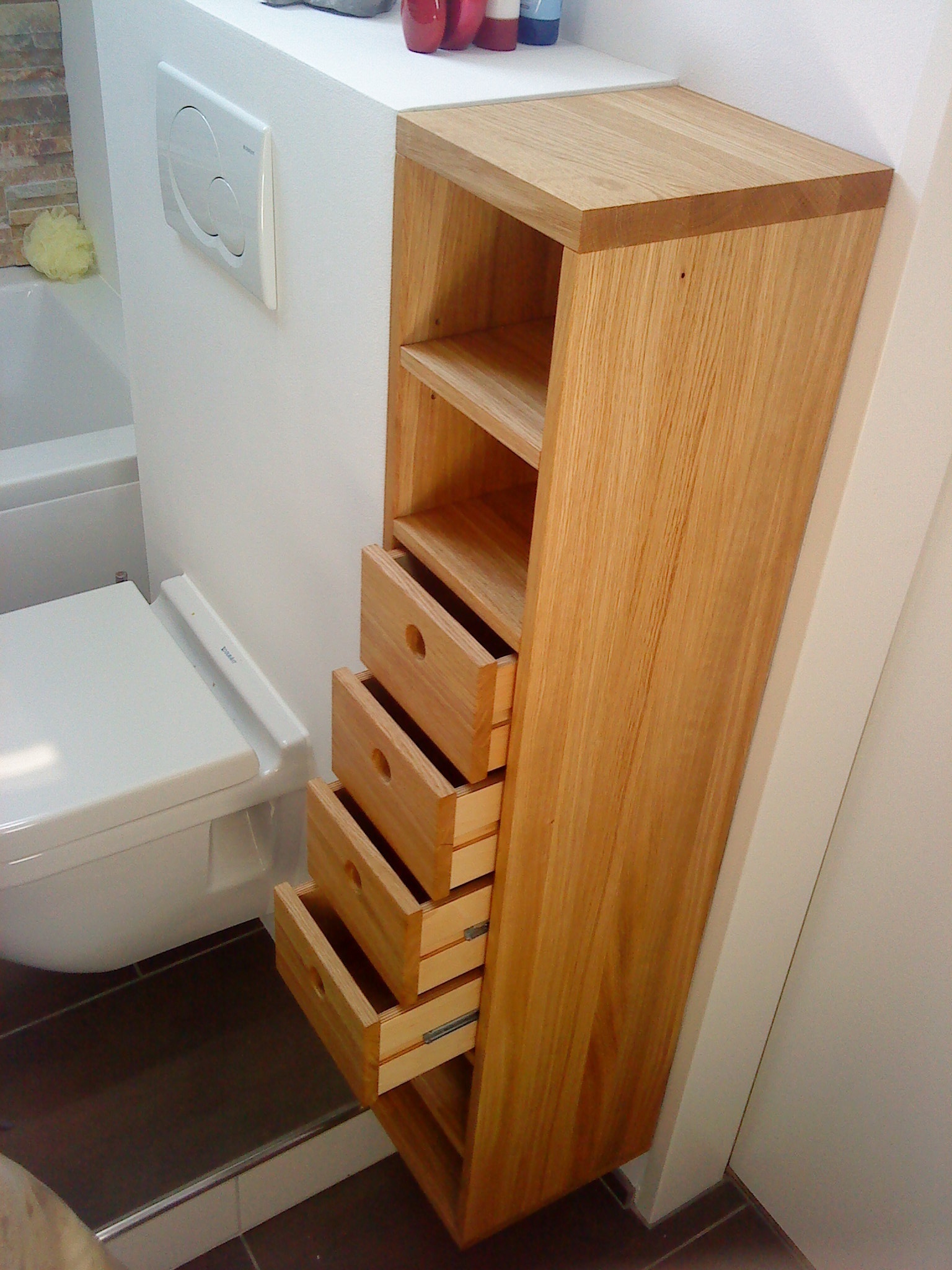 Freischwebend sitzt dieses kleine Regal im Bad. Der viele Stauraum entstehd durch die Fächer und Auszüge. Da es sich direkt neben der Toilette befindet, ist im "Notfall" die rettende Toilettenpapierrolle nur eine halbe Armlänge entfernt.