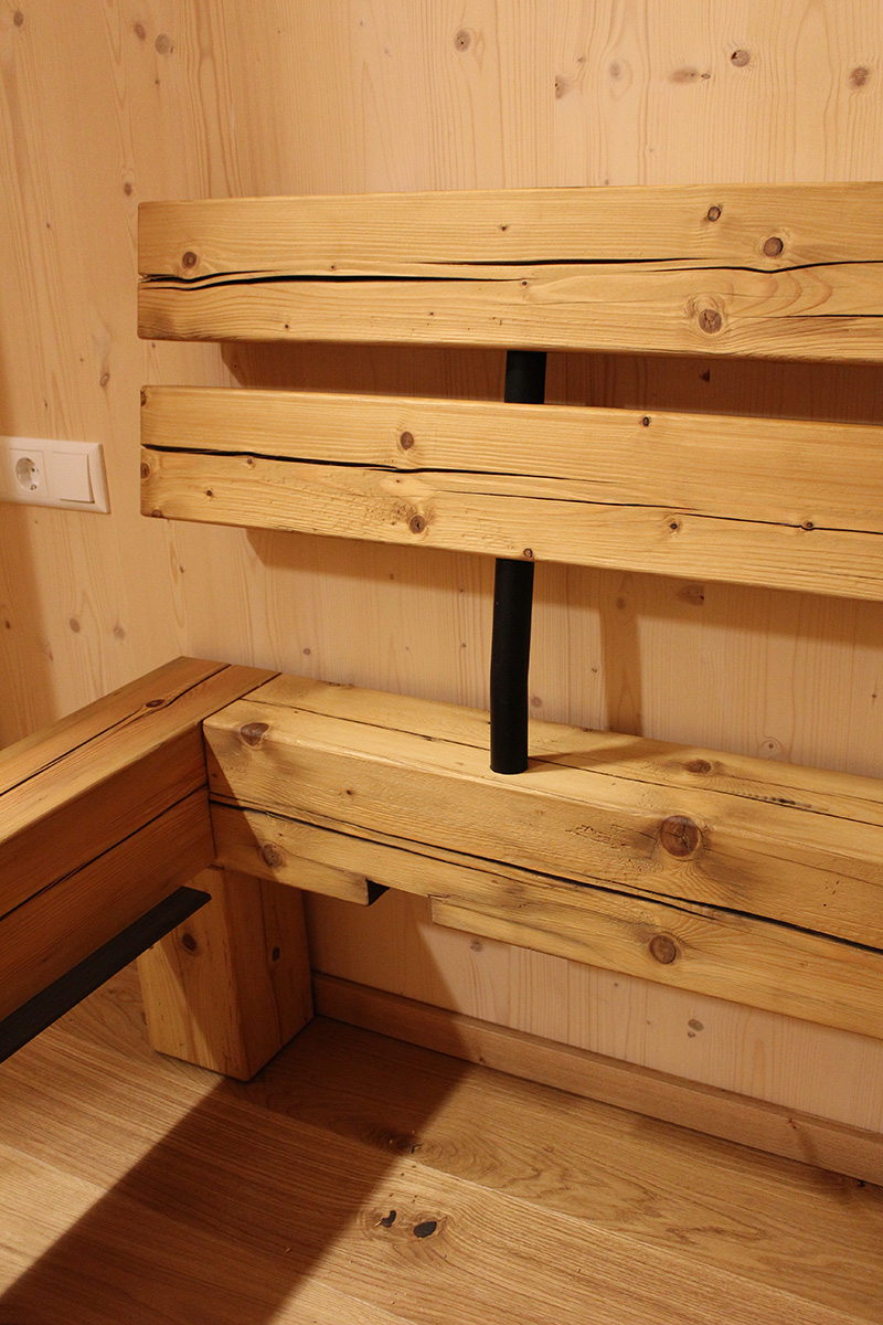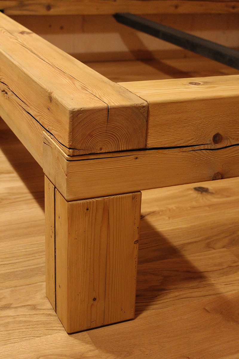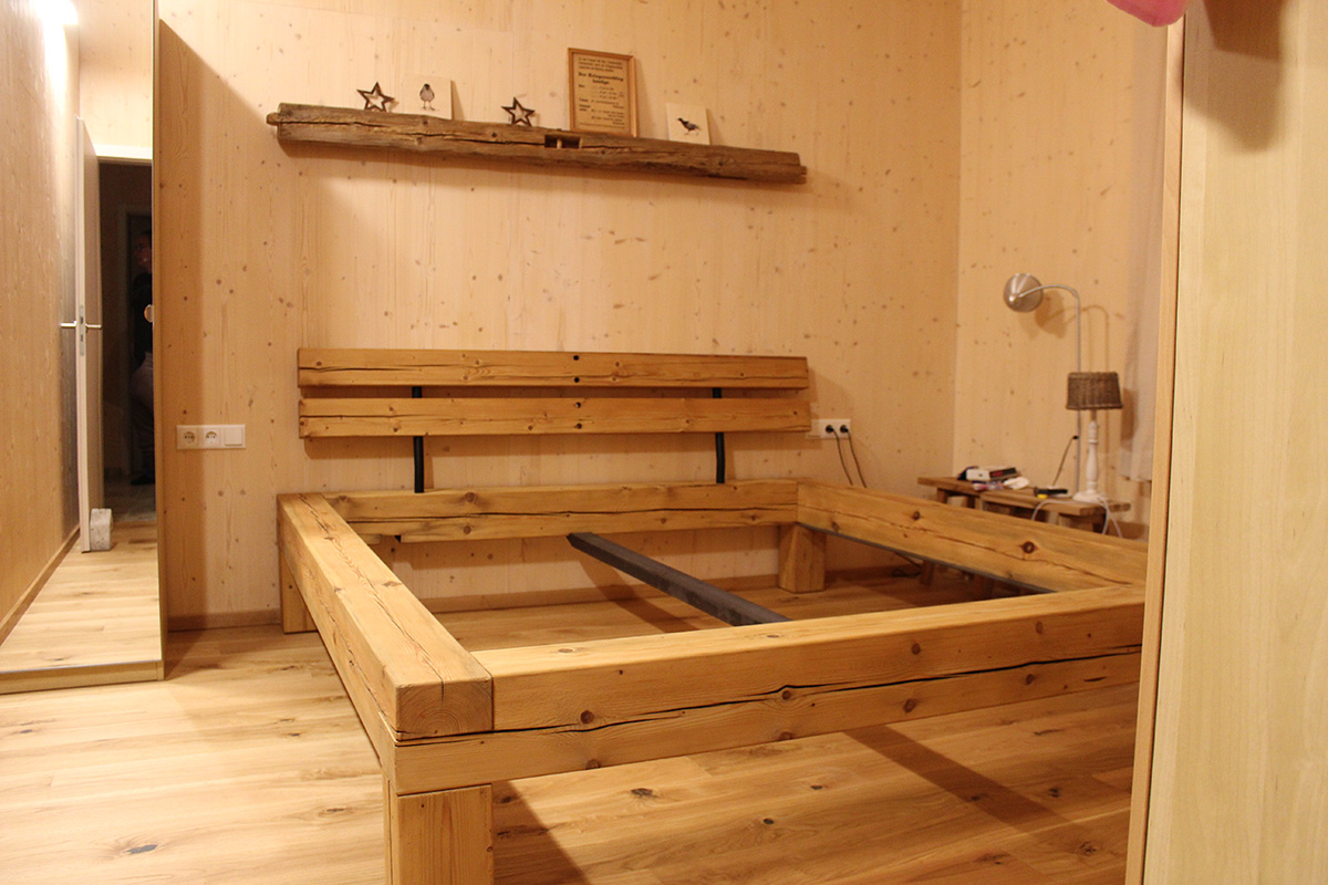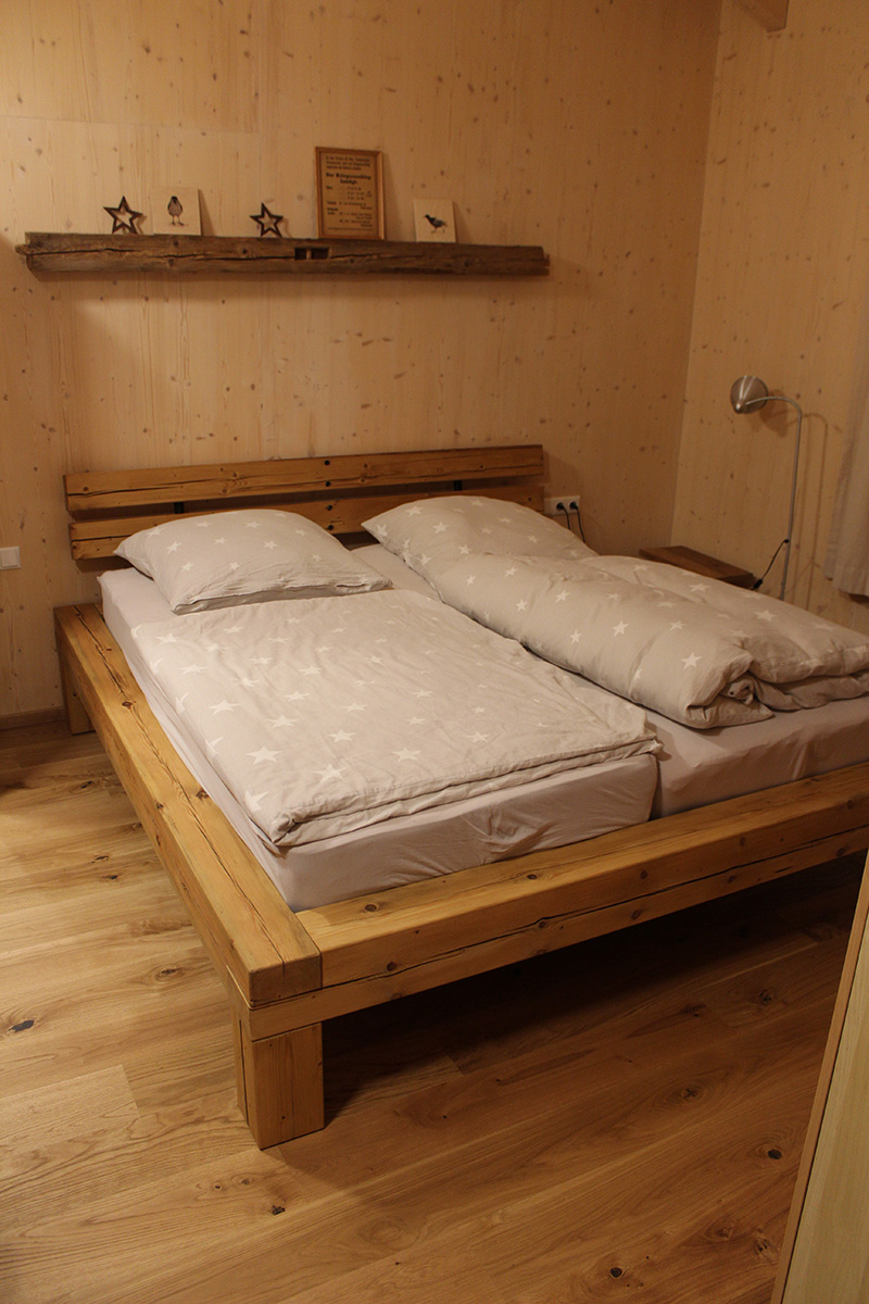 Aus alten Balken entstand dieses Bett. Neu abgeschliffen verleihen sie dem Bett eine warme Optik. Die noch existierenden Risse in den Balken geben dem Ganzen einen Hauch von Altem.