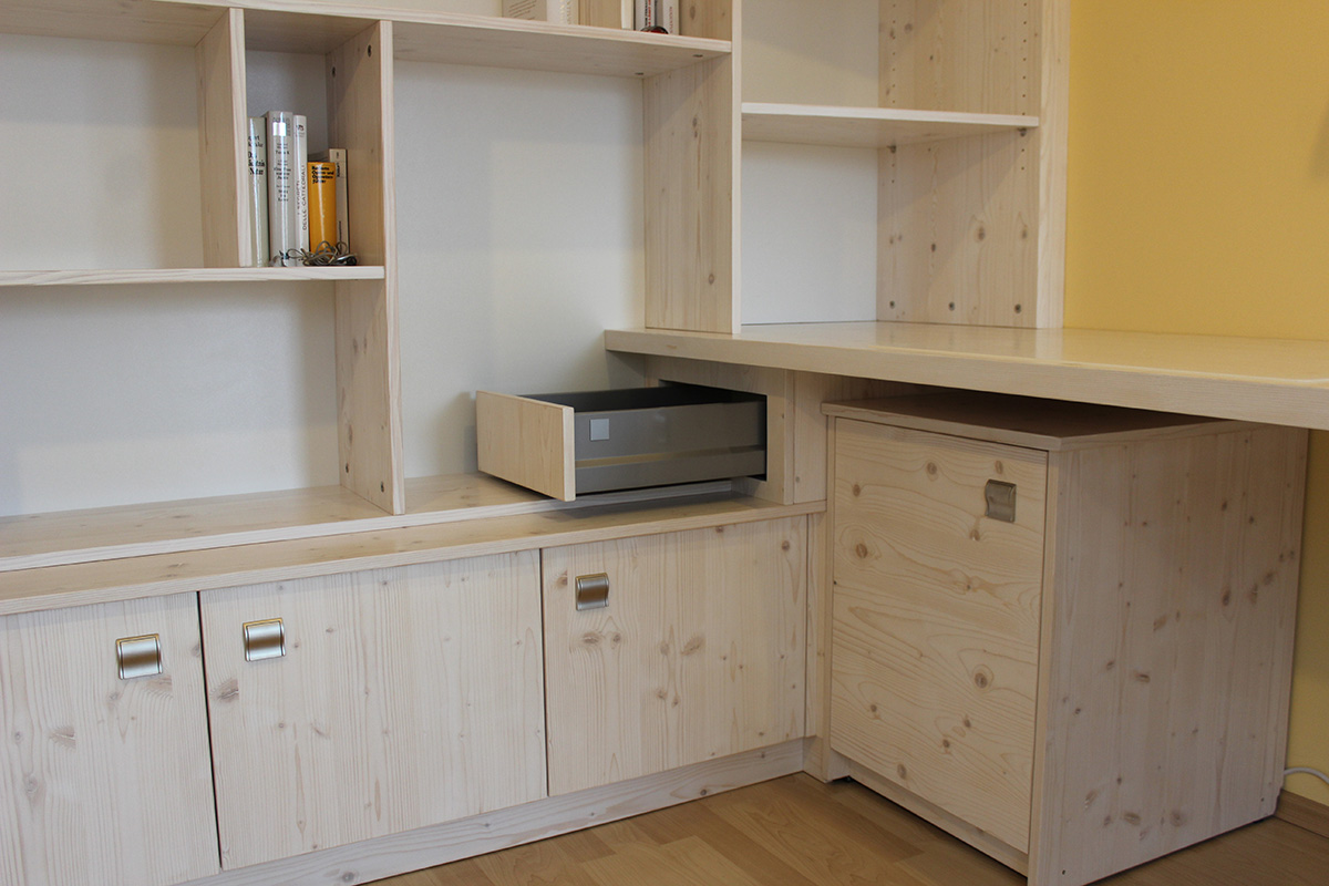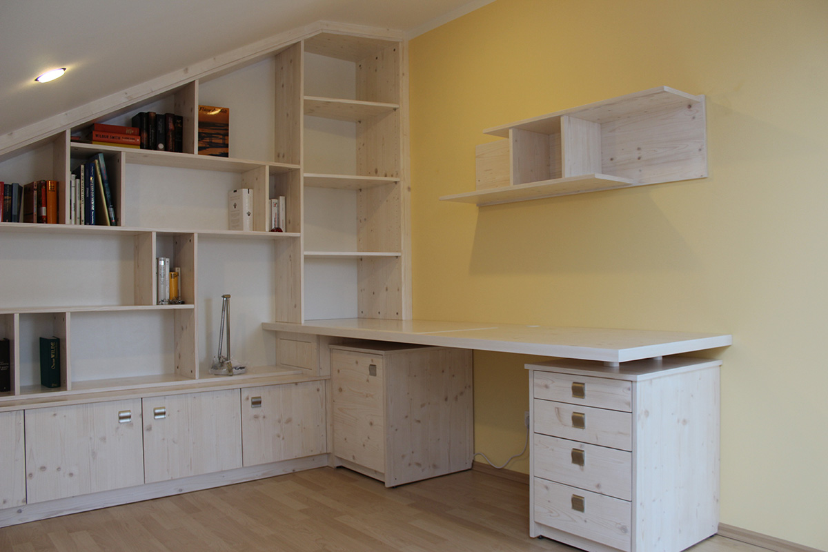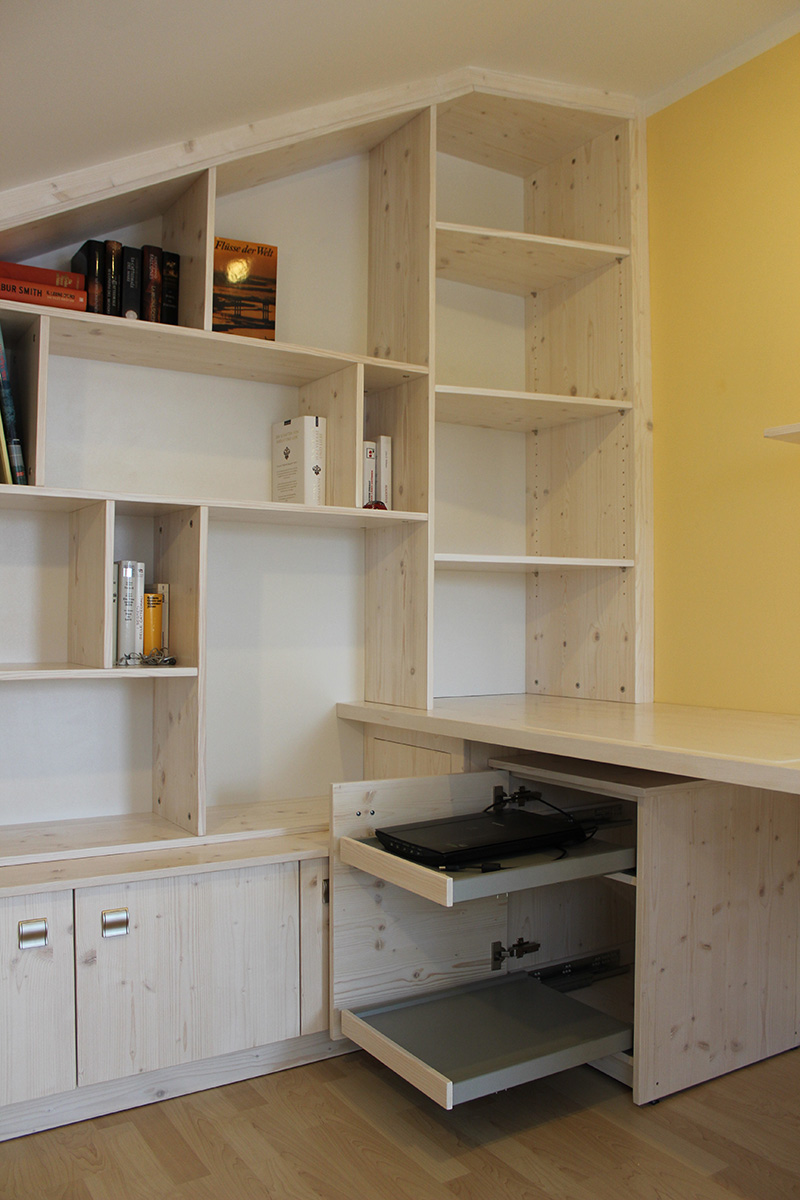 Um das Büro effektiv ausnutzen zu können, wurden alle Elemente passgenau unter der Dachschräge gefertigt und montiert. Die meisten Oberflächen durften ihren natürlichen Charme behalten. Ein Regal über der Schreibtischplatte ergänzt die Komposition. Ausgestattet mit Auszügen, Fächern und Ablagen, bietet es ausreichend Platz für alle benötigten Dinge.