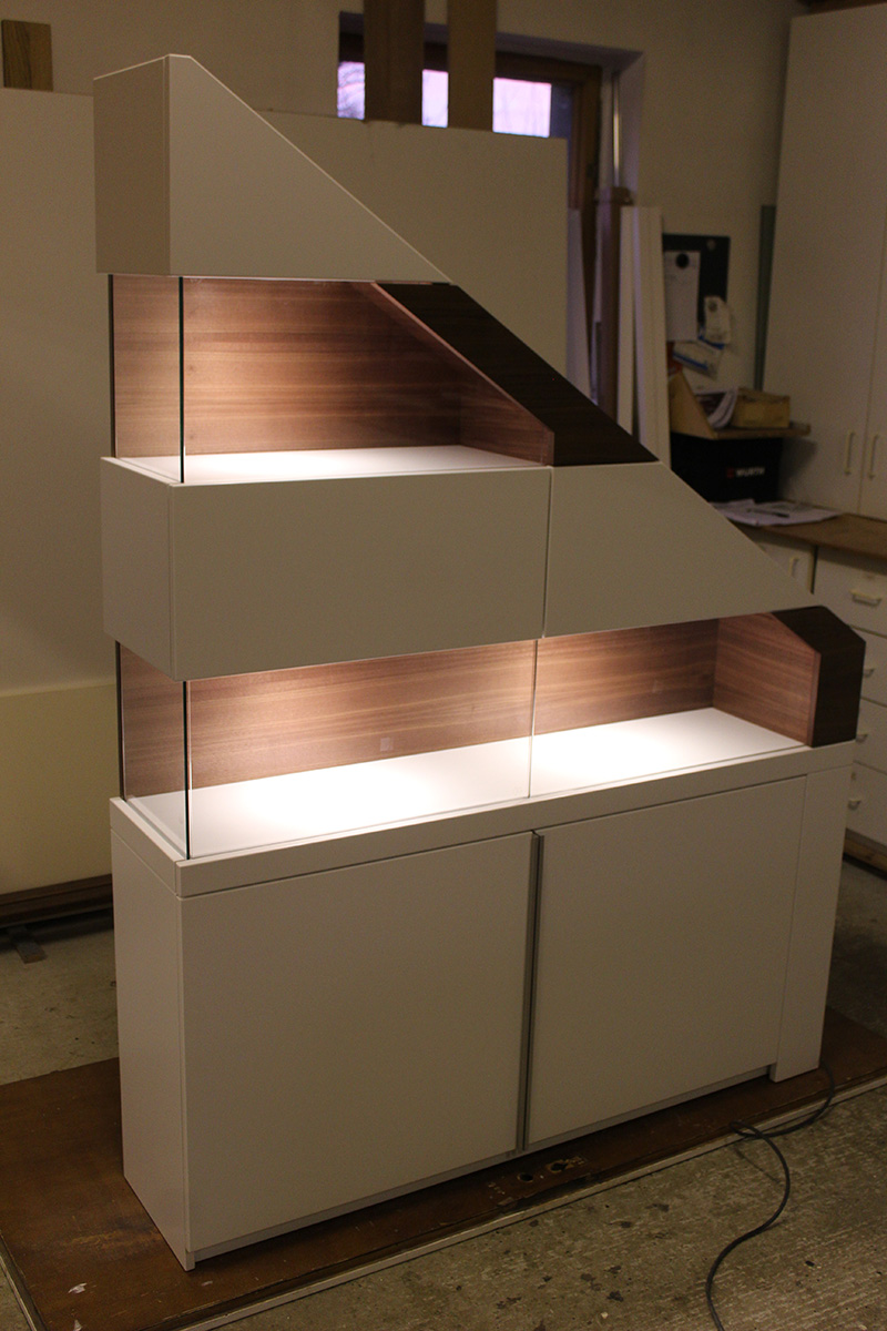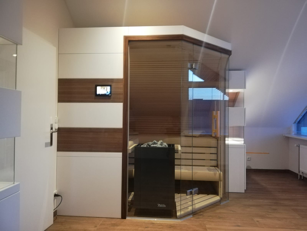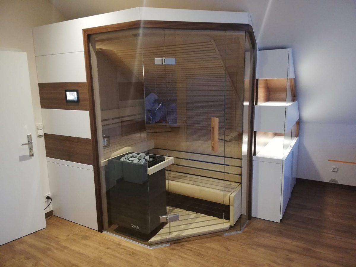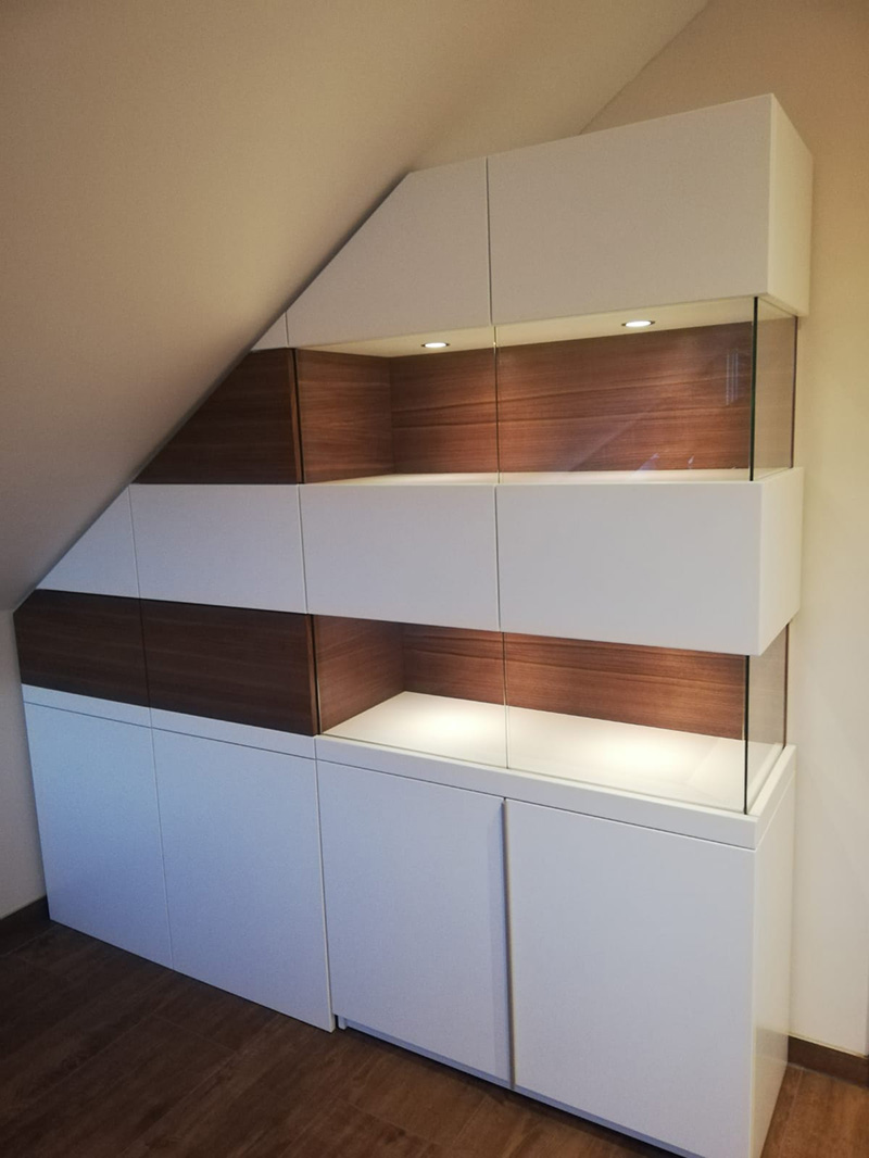 Die Herrausforderung bestand darin, zum einen die Dachschräge abzufangen, als auch den Stil auf die bereits vorhande Saune abzustimmen. Als optisches Highlight besteht der Schrank auch etagenweise aus Vitrinen. Der Wechsel zwischen dem robusten Holz und dem zerbrechlichen Glas gibt dem Ganzen etwas Besonderes.