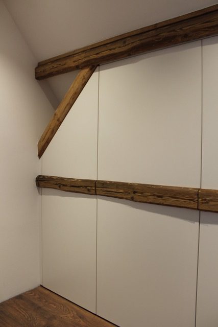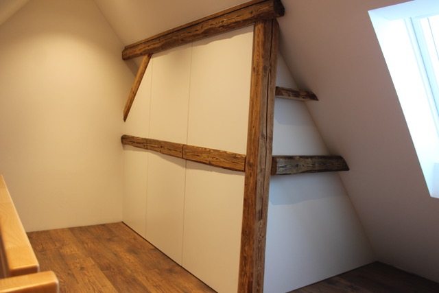 Diesen Schrank erkennt man nicht gleich auf den ersten Blick. Mit Altholz wurde ein Teil des Dachgebälks simuliert, in welchen der Schrank untergabracht ist. Somit erhielt die glatte Dachschräge ein paar ansprechende Ecken und Kanten. Neben den Türen, welche die Fächer verstecken, kommt ein Teil des Schrankes in voller Höhe als Auszug zur Verwendung. Der Kontrast zwischen dem Weiß- und Altholz spielgelt sich im gesamten Raum wider.