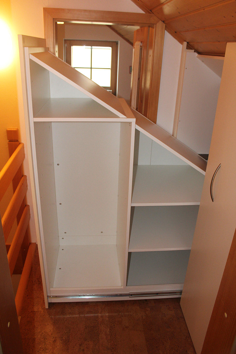 Hier wurde nur schwer nutzbarer Raum zu einem Schrank mit ordentlich Platz umfunktioniert. Besonders die Großraumauszüge bringen die Möglichkeit mit, jeden Quadratzentimeter des Bereiches gut ausnutzen zu können. Das der Schrank auch eine optische Aufwertung ist, ist dabei ein gewollter "Nebeneffekt".