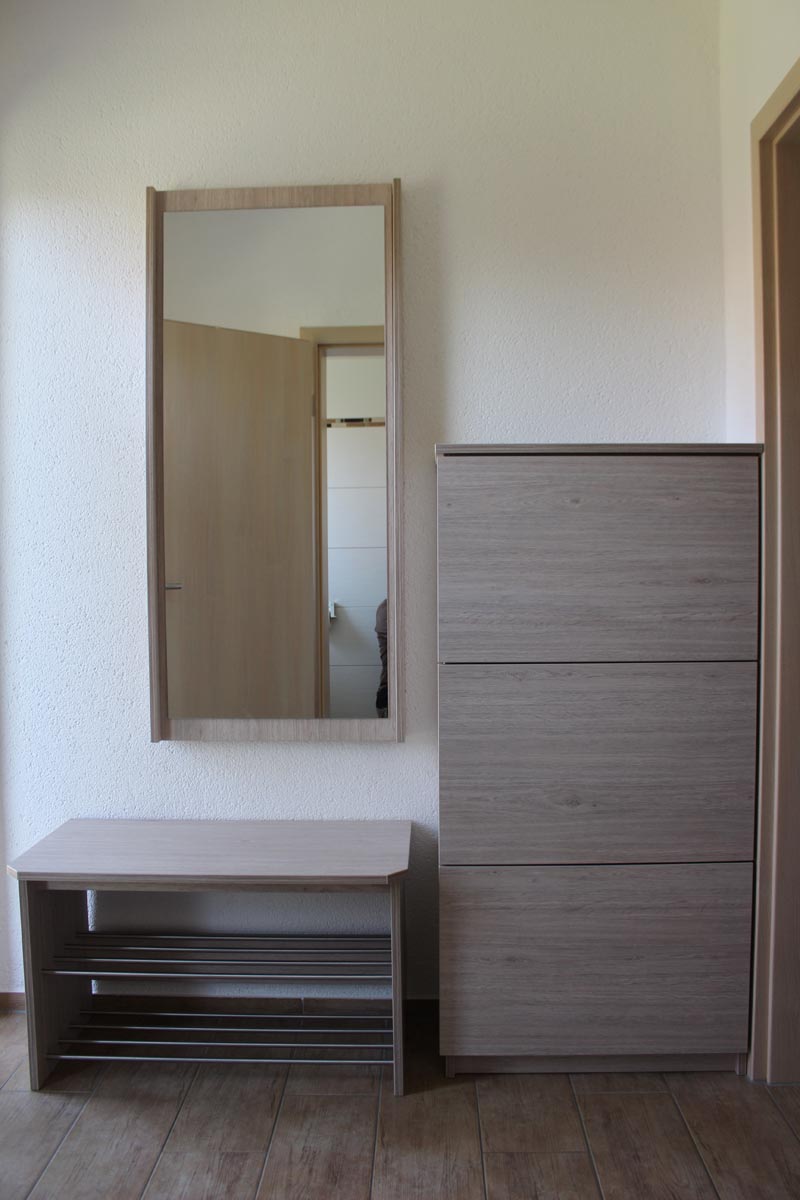 Die Garderobe in ihrem grauen Holz fügt sich gut vor den hellen Wänden ein. Das Besondere ist, dass man den Spiegel auf Schienen zur Seite wegschieben kann. Dahinter befindet sich, der Stromkasten, welcher somit dem Auge verborgen bleibt.