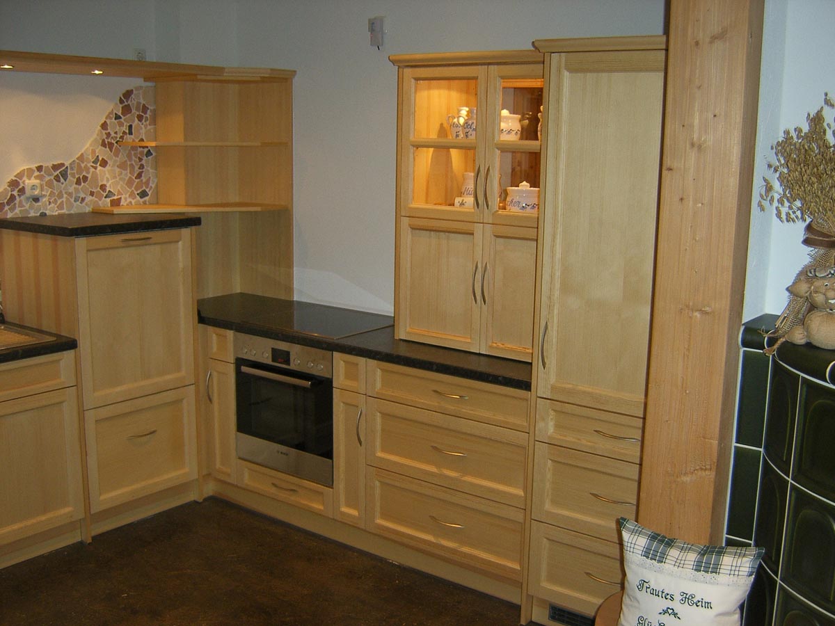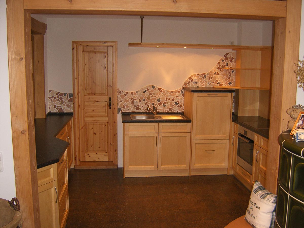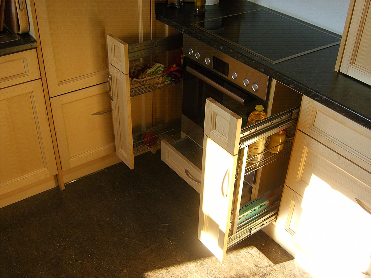 Bei dieser Küche wurde der alte Zugang vom Flur zur Küche mitverwendet. Der Durchgang wurde nur bis auf Höhe Arbeitsplatte mit Gipskartonplatte verschlossen, sodass der darin stehende Unterschrank übertief angefertigt werden konnte um weiteren Stauraum zu gewinnen. Darauf wurde ein aufstehender Hängeschrank aufgesetzt.