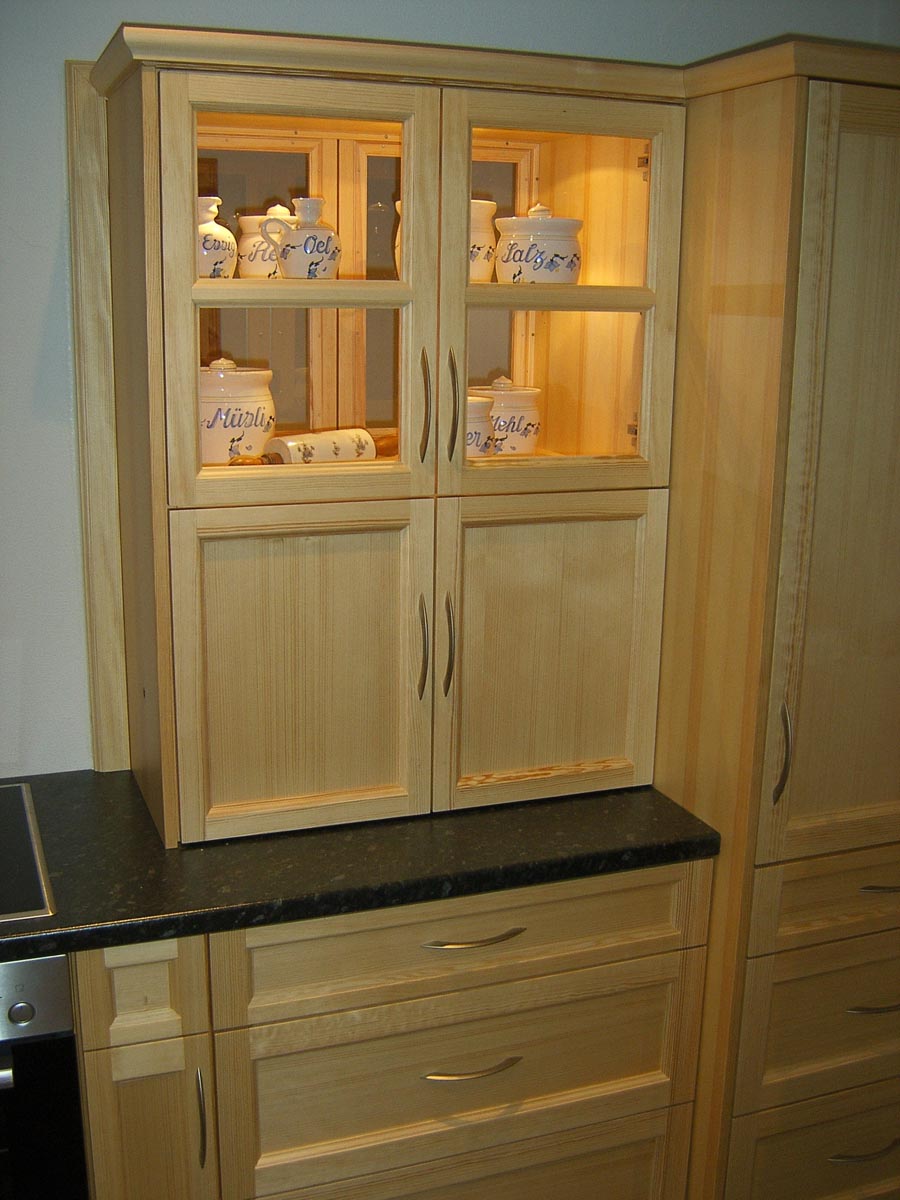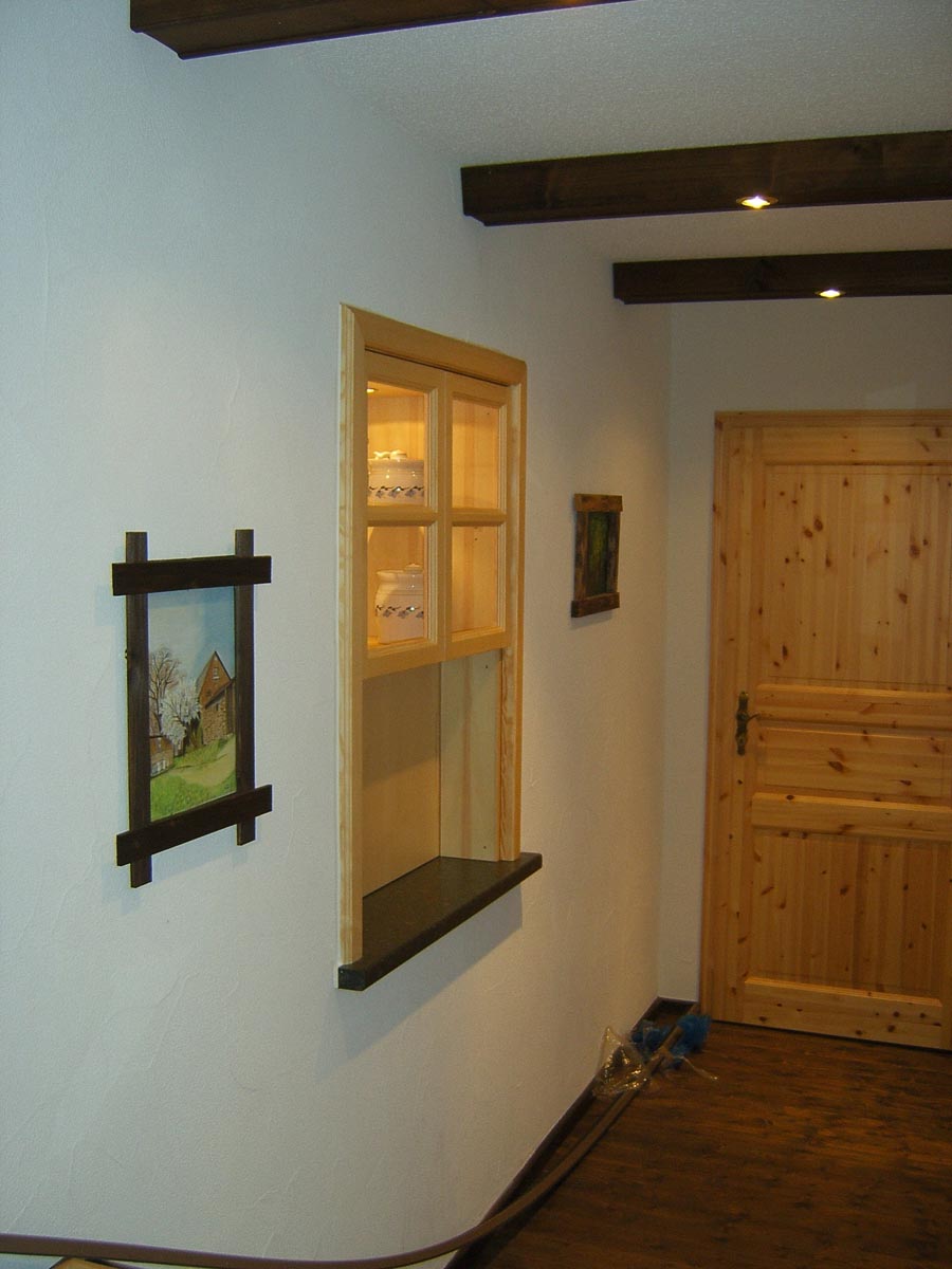 Oben besitzt der Schrank einen Rahmen mit Kreuzsprosse und Glasfüllung als Rückwand. Hier kann das natürliche Licht von Küche in den Flur gelangen. Im Flur soll die Optik des Schranks dem eines Fensters gleichen.