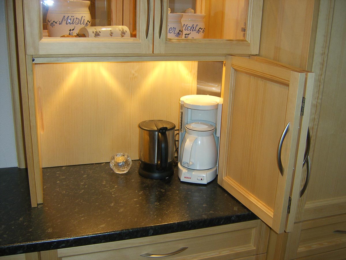 Vorn mit Falttüren, unten geschlossen damit die Küchengeräte versteckt sind, wenn man diese schließ. Die „Rückwand“ wurde als Schiebetür ausgearbeitet, welche sich hinter den angrenzenden Hochschrank verschiebt. Dadurch erhält man den Zugang zum Flur und der Einkauf kann direkt in die Küche geschoben/gestellt werden.