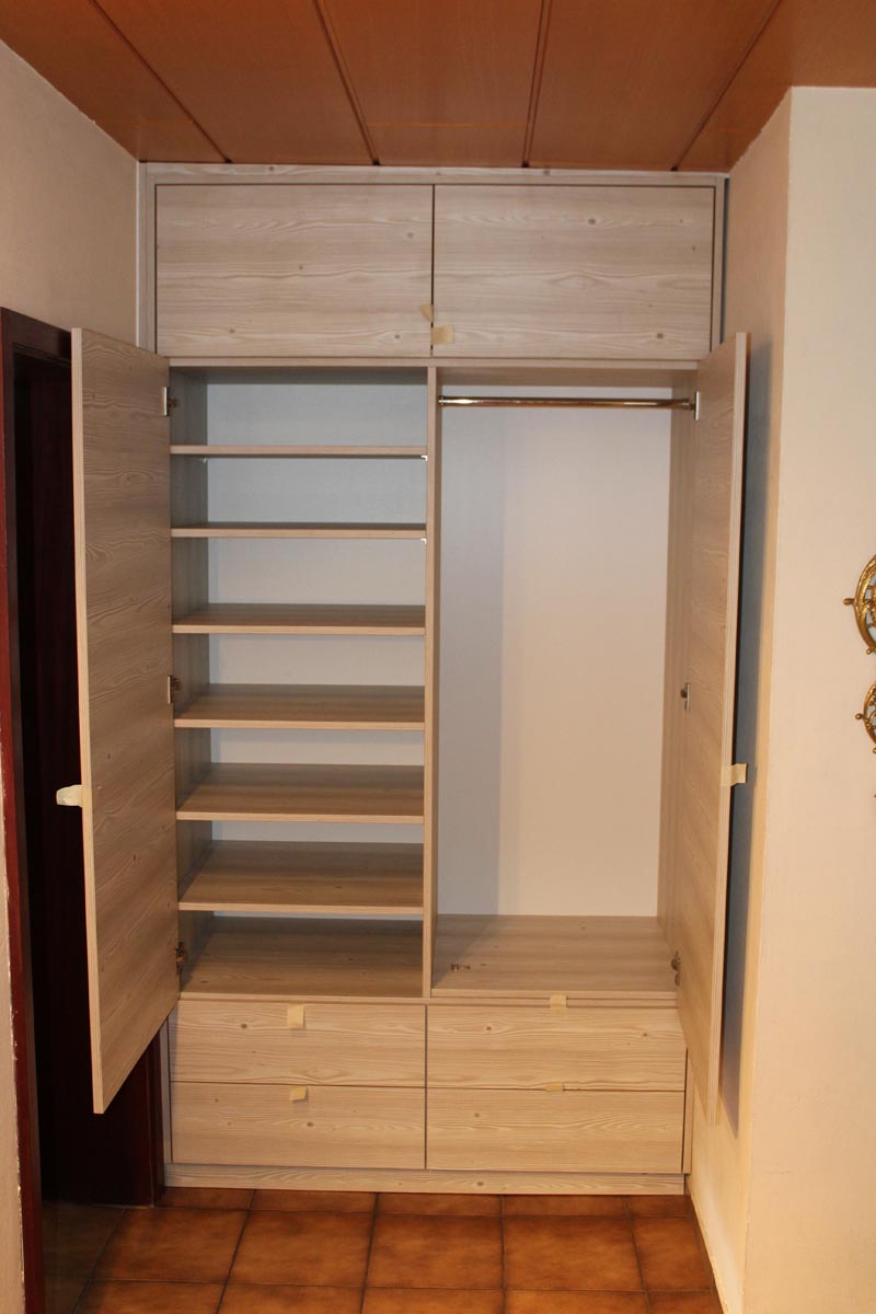 In voller Höhe füllt der neue Schrank die Nische im Flur dieses Hauses aus. Mit vielen Fächern und Auszügen wird hier werttvoller Stauraum geschaffen.