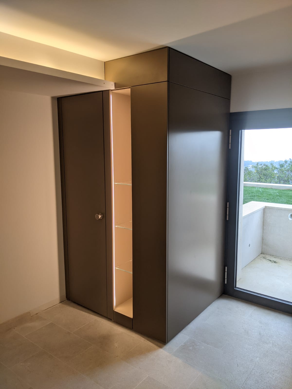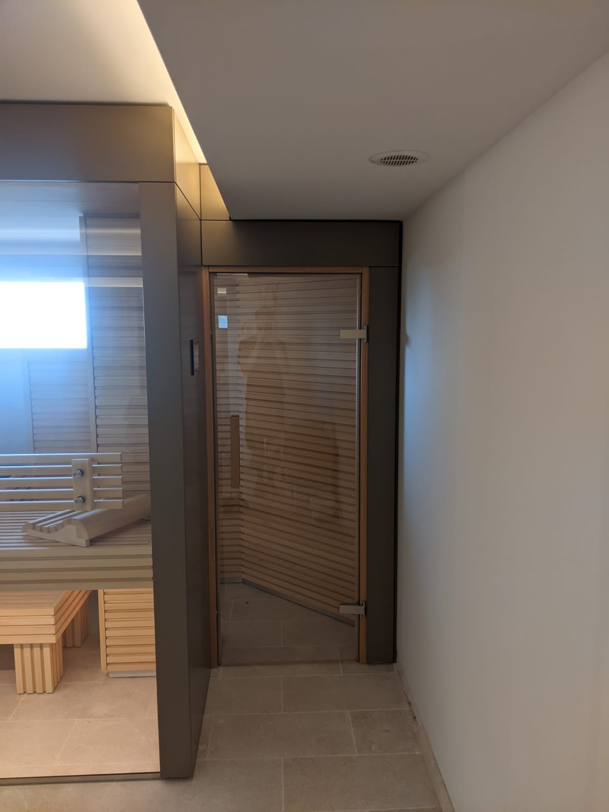 Die Kombination aus Glas und Holz verleiht der Sauna eine gewisse Eleganz. Diese wurde auch auf den Nischenschrank übertragen.