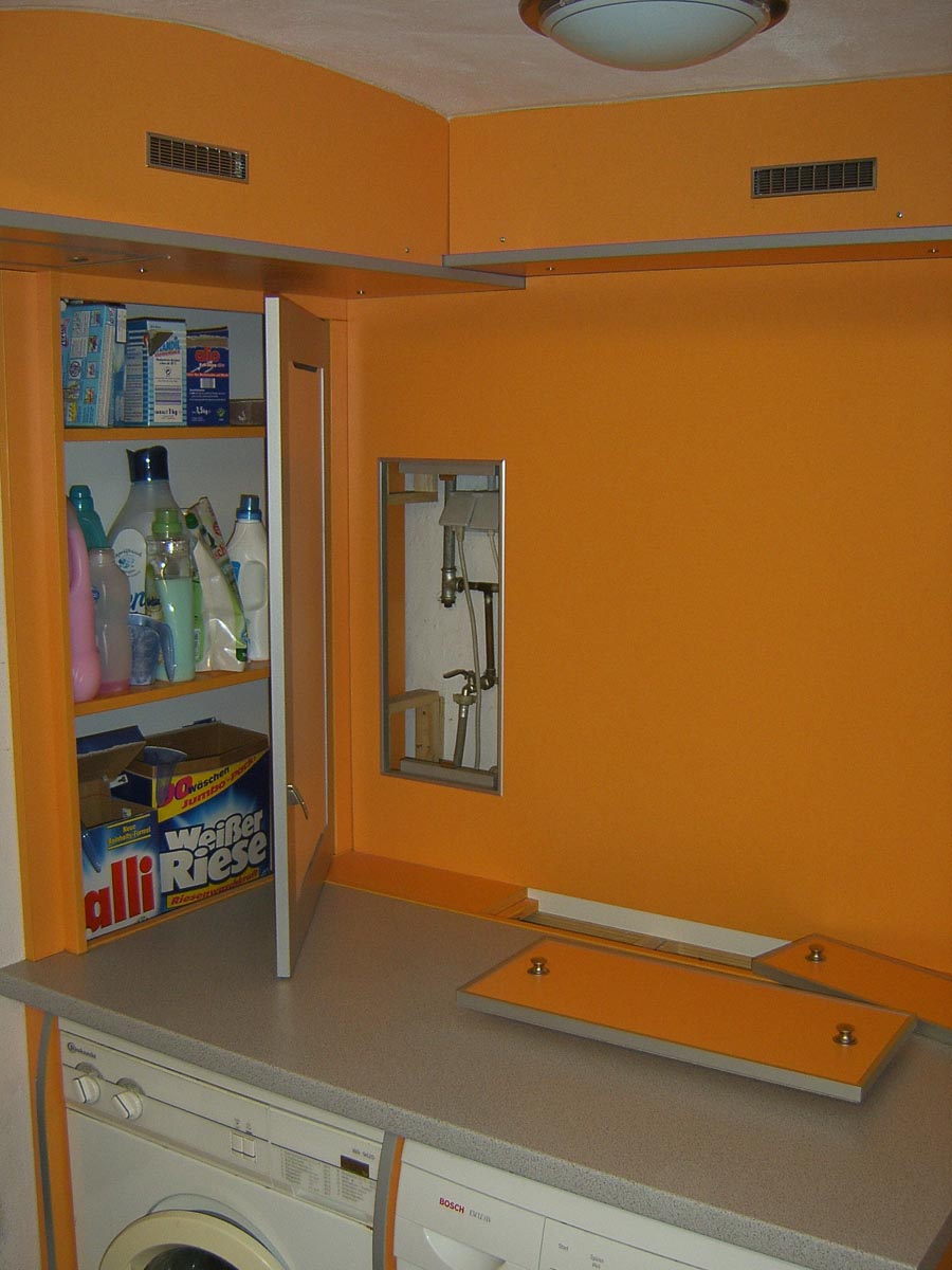 Bei diesem Projekt wurde zusätzlicher Stauraum für die Waschküche praktisch eingebaut. Es entstanden Stauraum und Regale für alles, was dort benötigt wird. Dabei wurde auch daran gedacht, dass die Zugänge zu Strom- und Wasseranschlüssen verdeckt sind, trotzdem aber gut und einfach erreichbar sind.
