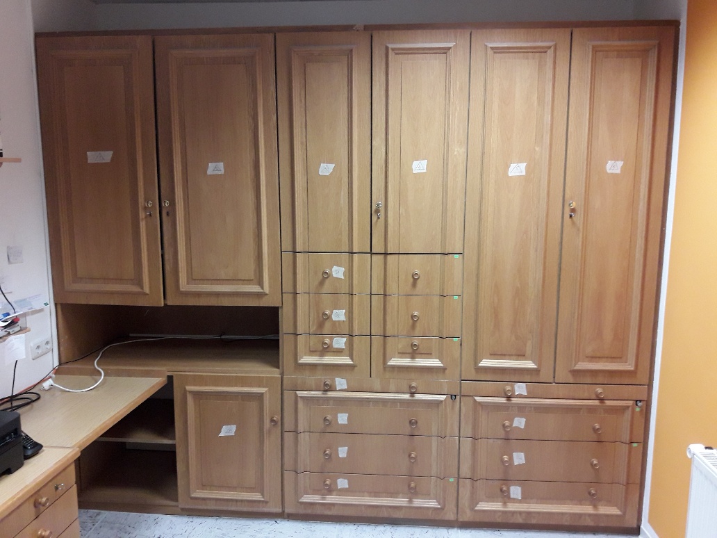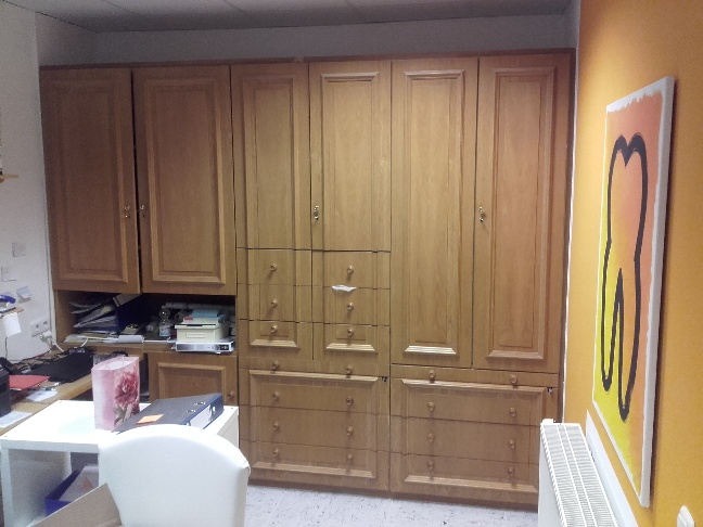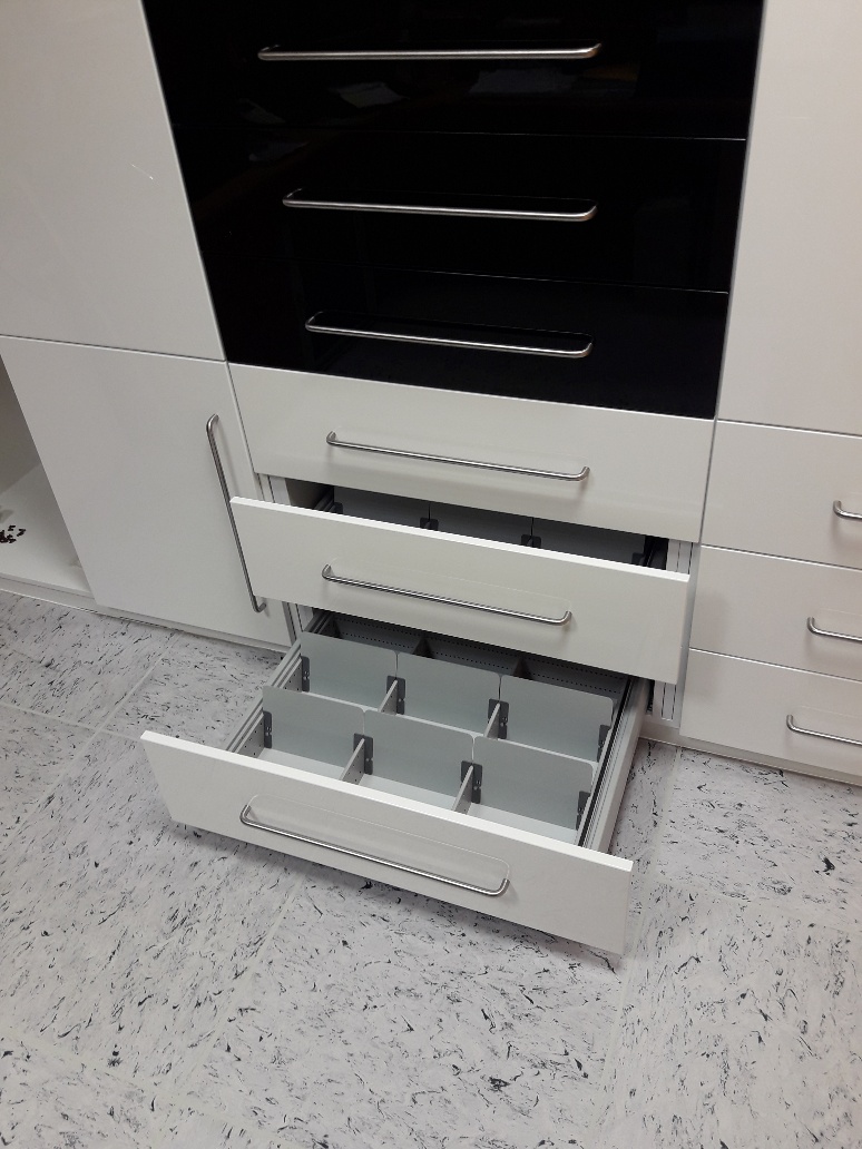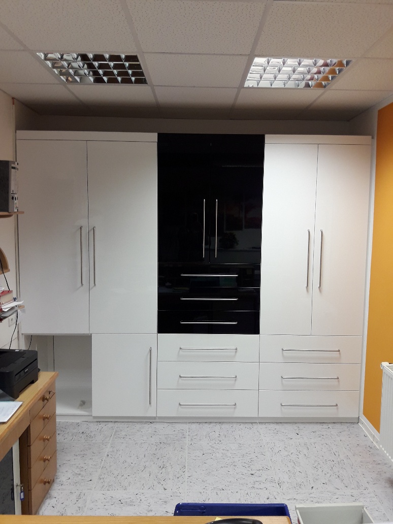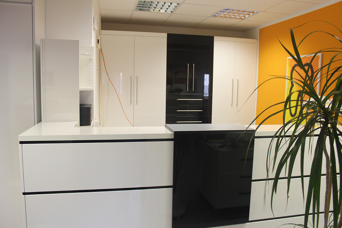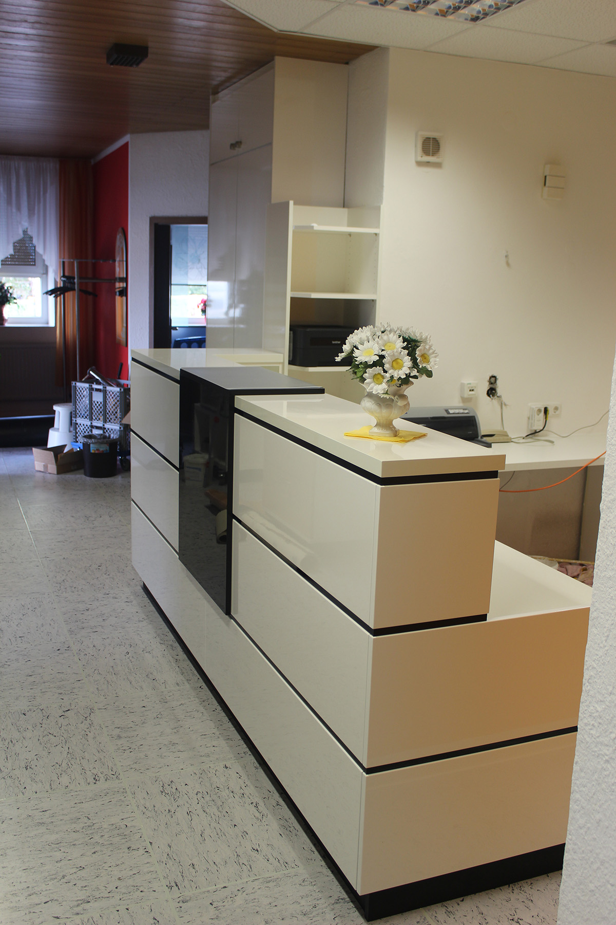 In dieser Praxis wurde der Einbauschrank erhalten und lediglich mit neuen Türen und Schubkästen ausgestattet. Der Schrankkörper wurde ebenfalls den neuen Blenden und Türen angepasst.