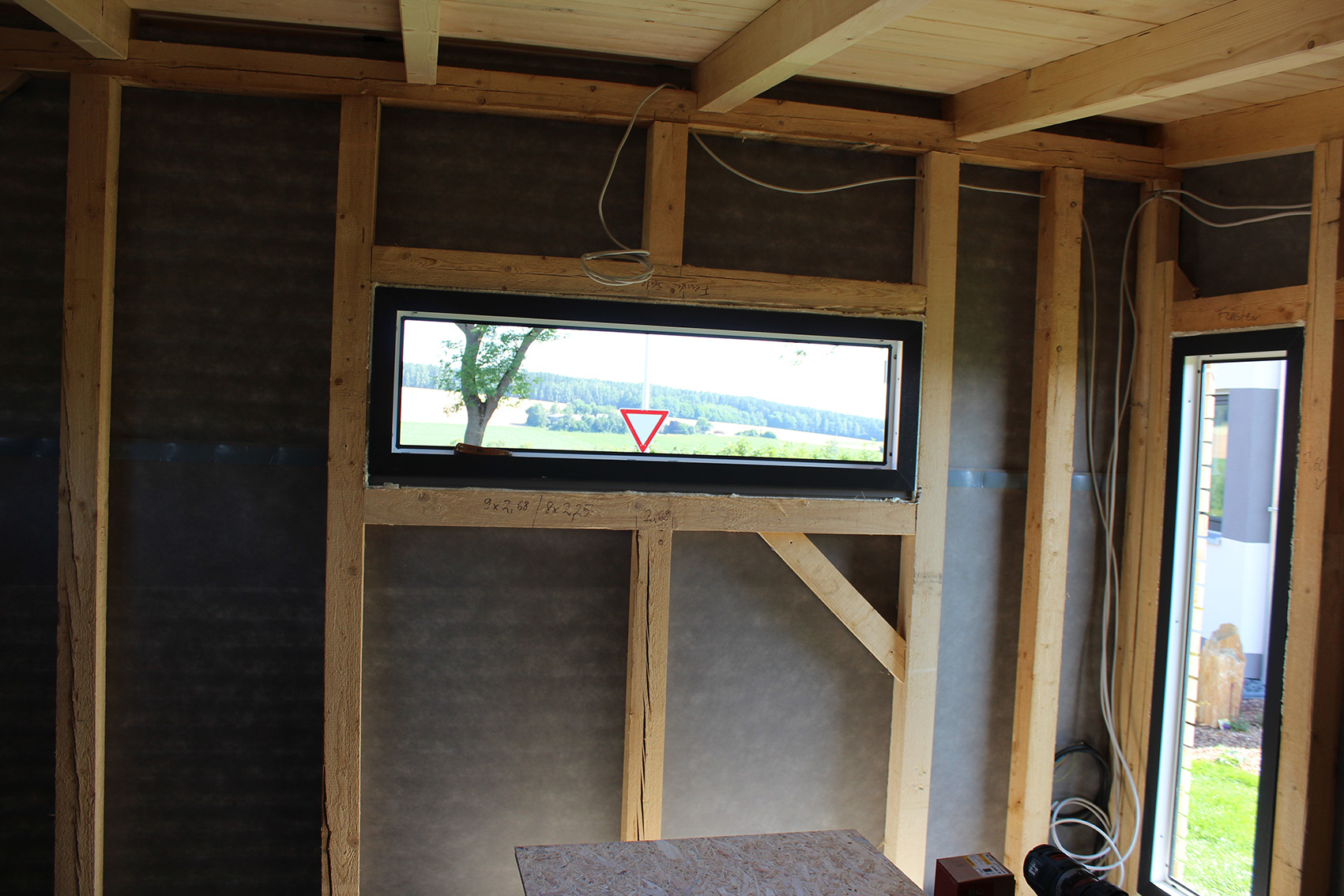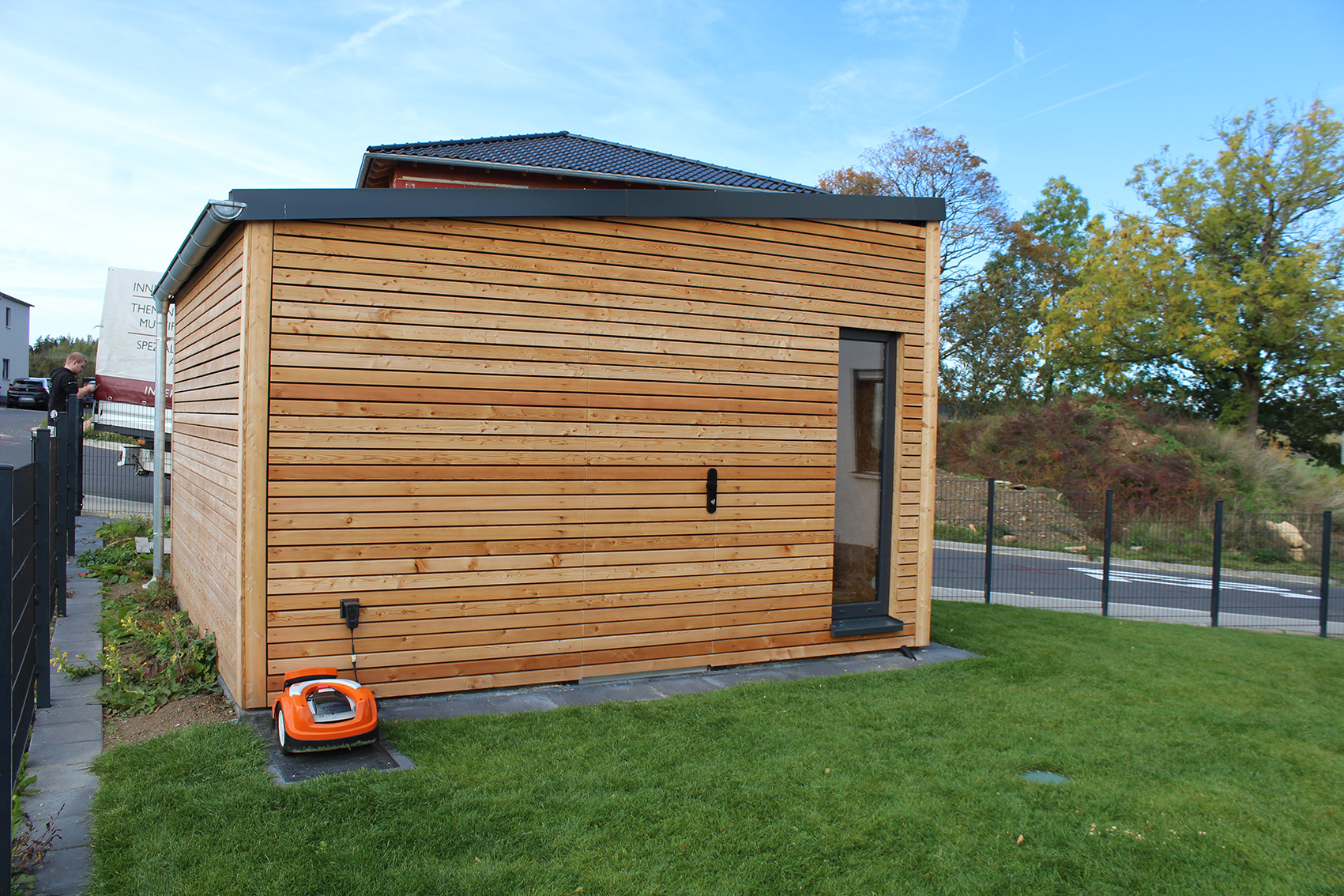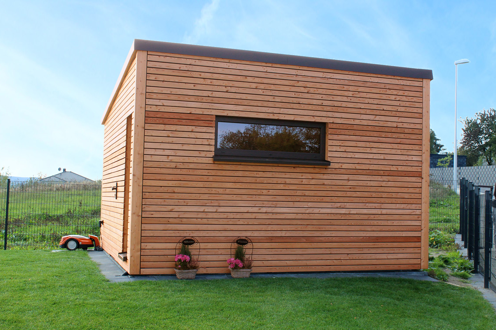 Neben dem modernen Steinhaus ergänzt dieses Gartenhaus das Anwesen mit einem natürlichen Rohstoff - Holz. Die Form lehnt sich dabei wieder an die Moderne des Hauptgebäudes an. Gleichzeitig dient es auch als "Tankstelle" für den Rasenroboter.